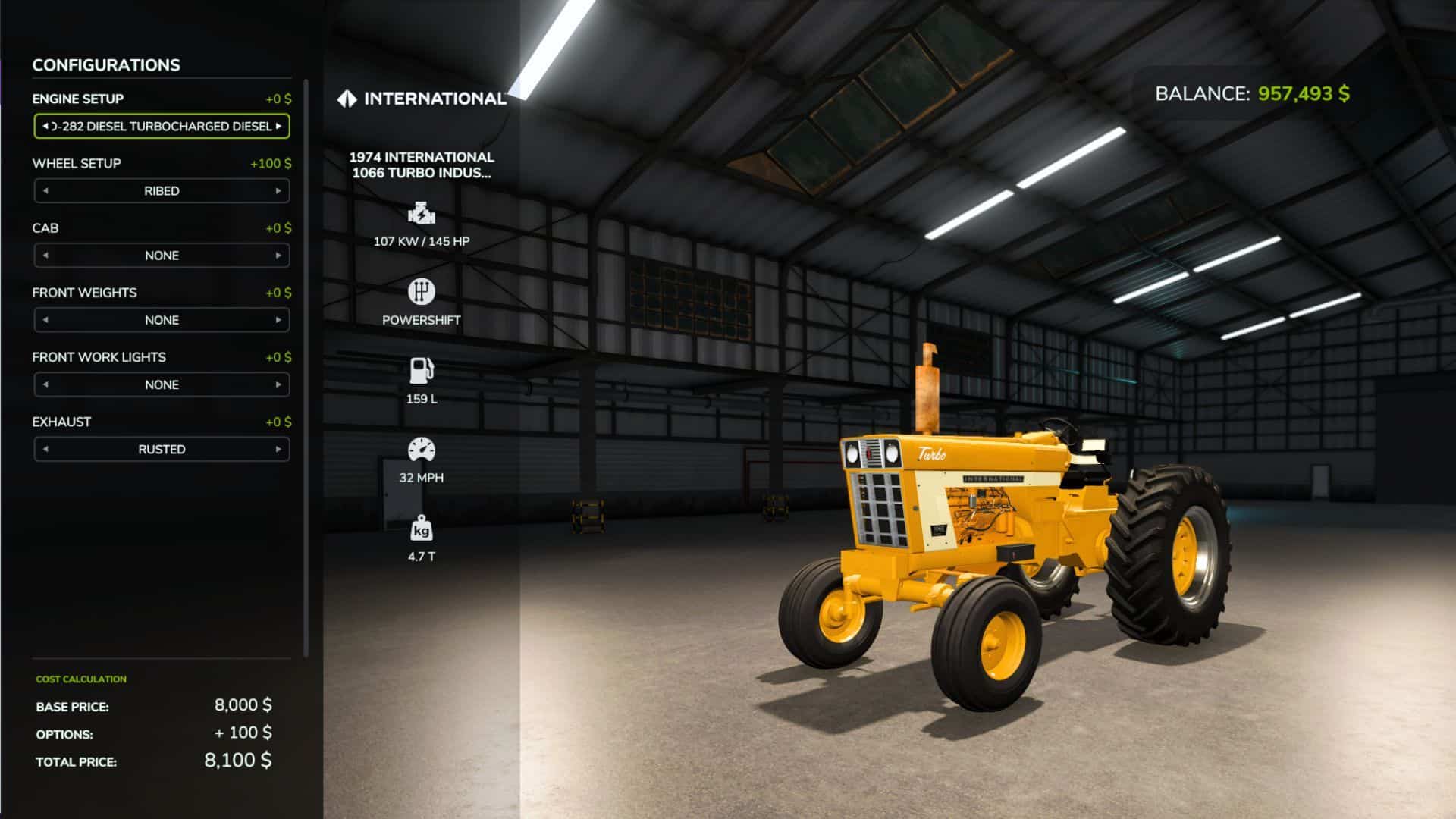 There is two versions available for download. The standard red and a Industrial yellow variant. The International Harvester Farmall 1066 was made by International Harvester from 1971 to 1976. The 1066 has a six-cylinder diesel engine and about 105 drawbar and 125 PTO horsepower. Ours has been both engine power and speed (33 mph) increased for todays demanding farming tasks. The 1066 is significant for its popularity, with over 50,000 units having been built in its six-year run. There were two variations of the 1066, those being the more standard turbocharged 1066, and the Hydrostatic transmission options, We have made the Turbo variant along with the industrial version. both detailed by their respective hood decals and or color. The hydrostatic version is described to have had greatly less power than the more standard turbo variation 1066.