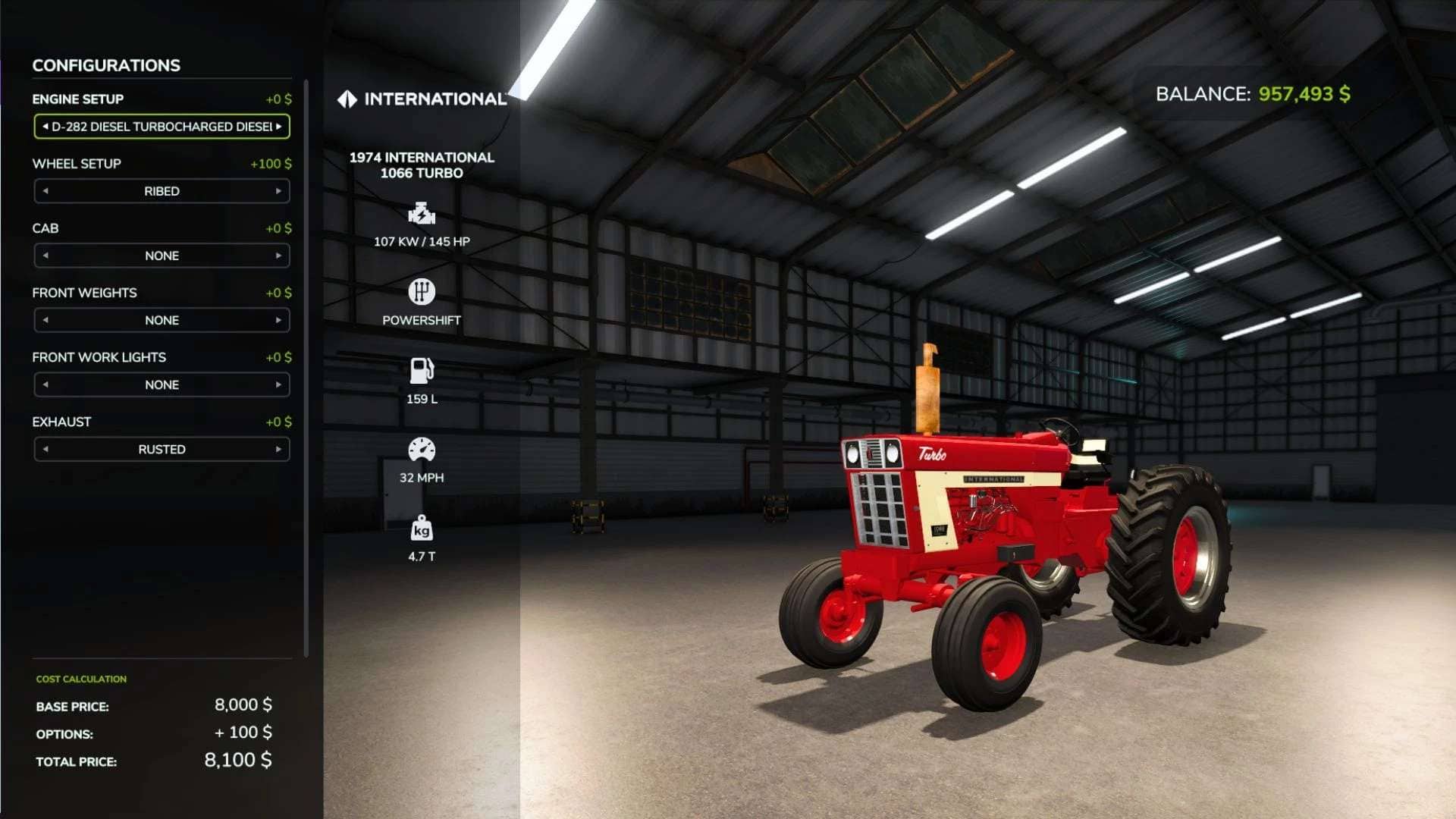The International Harvester Farmall 1066 was made by International Harvester from 1971 to 1976. The 1066 has a six-cylinder diesel engine and about 105 drawbar and 125 PTO horsepower. Ours has been both engine power and speed (33 mph) increased for todays demanding farming tasks. The 1066 is significant for its popularity, with over 50,000 units having been built in its six-year run. There were two variations of the 1066, those being the more standard turbocharged 1066, and the Hydrostatic transmission options, We have made the Turbo variant along with the industrial version. both detailed by their respective hood decals and or color. The hydrostatic version is described to have had greatly less power than the more standard turbo variation 1066.