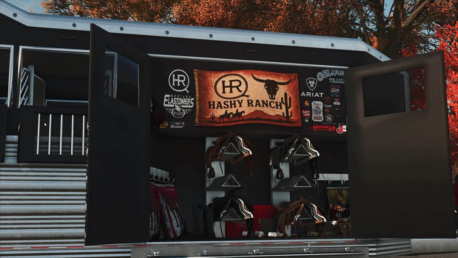 – Double door trainer side tack, integrated hay pod, large front dressing room with boot box, shelves, and clothes rod