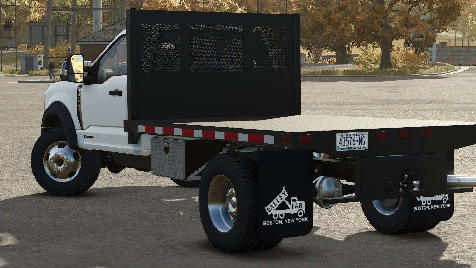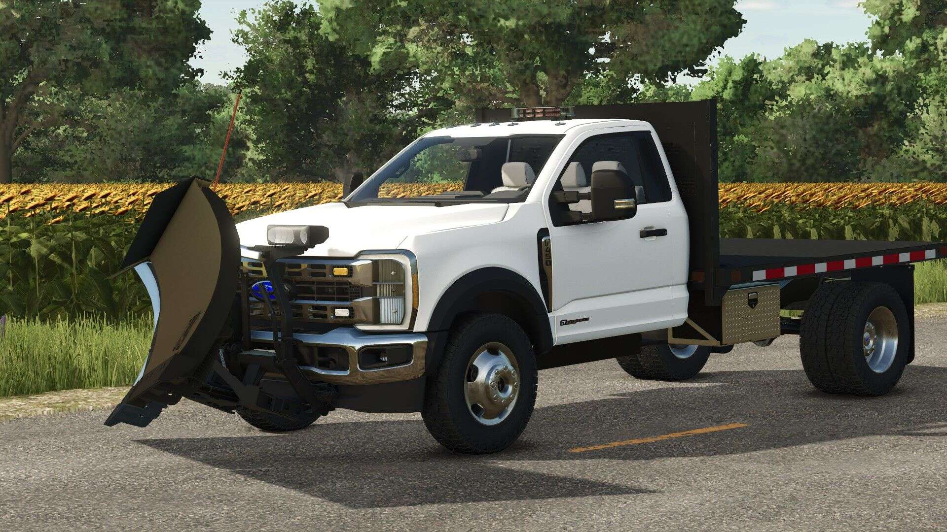 This truck has tons of options, like front winch, strobes, steps, trim levels, plow mount, etc. The flatbed is a modified version of the flatbed from the in game International CV. You can use this truck with the Western Wide Out and other plows.