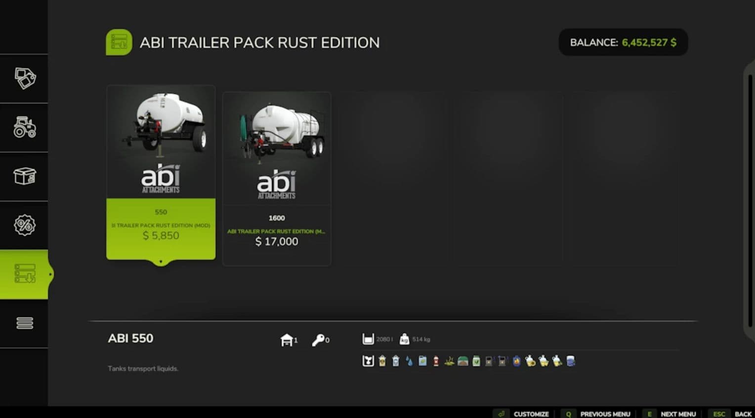 ABI Trailer Pack Rust Edition 1.0 FS25 Mods | 19 Nov, 2025 ABI Trailer Pack Rust Edition 1.0 – Price: ABI 550 $5850 – Capacity: 2080 – Price: ABI 1600 $17000 – Capacity: 6050 – Added rust for wear shader – Holds all liquids ingame Author: Adub Modding ABP Team This content was uploaded by our website visitors. If you notice any errors, please let us know.