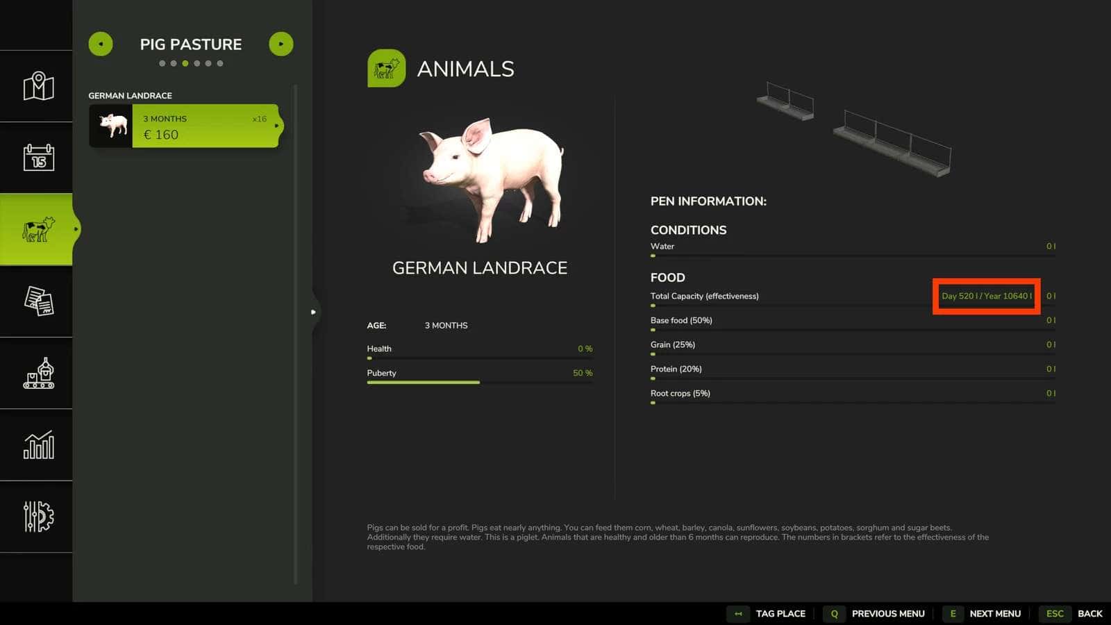 This script calculates and displays the daily and yearly feed requirements for all animal husbandries in the animal menu. The calculation is based on the actual animal types, age groups and feed rations in each husbandry.