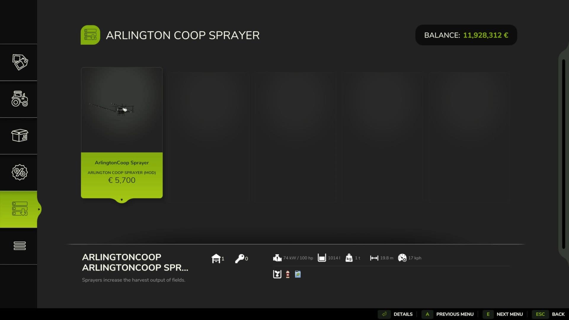 Arlington Coop Sprayer v1.0 FS25 Mods | 22 Jan, 2026 Arlington Coop Sprayer v1.0 A small sprayer from Arling Cooperative. – Price : 5.700€ – Required power : 100hp – Capacity : 1.014L – Working Width : 19.8 Author: MrFarmTastic13 This content was uploaded by our website visitors. If you notice any errors, please let us know.