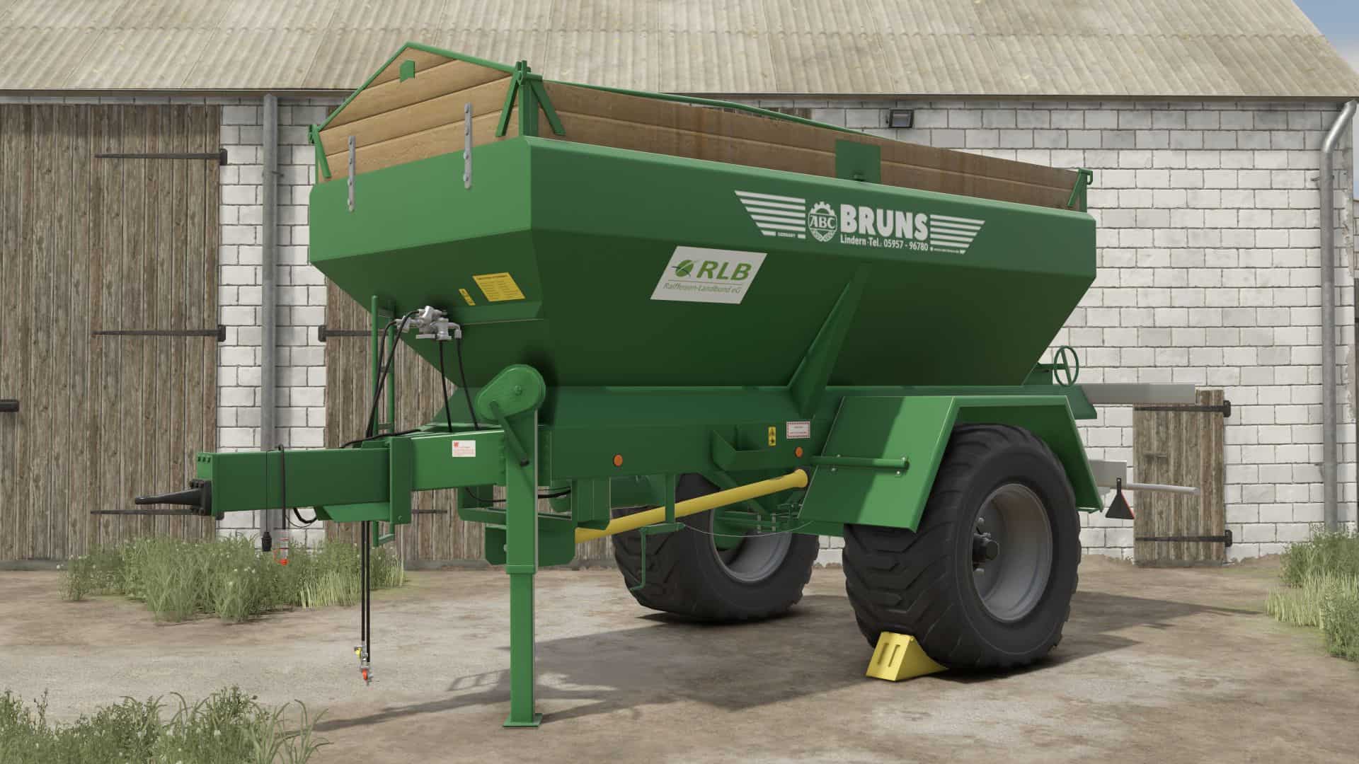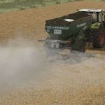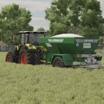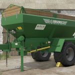 Single axle trailer for granulated and dusty fertilizer or limes, equipped with a 800mm wide conveyor belt and steep walls to avoid bridging effects.