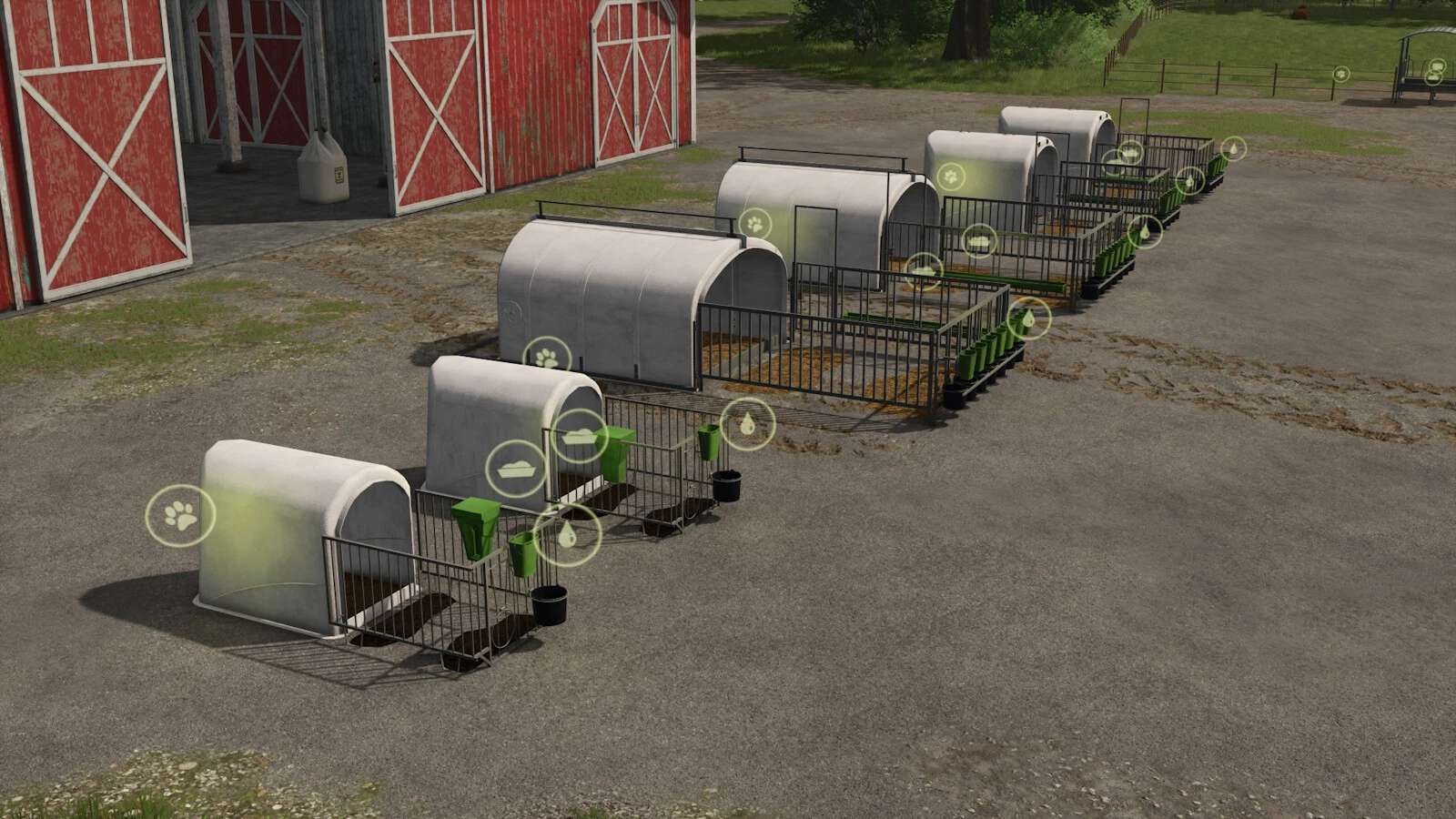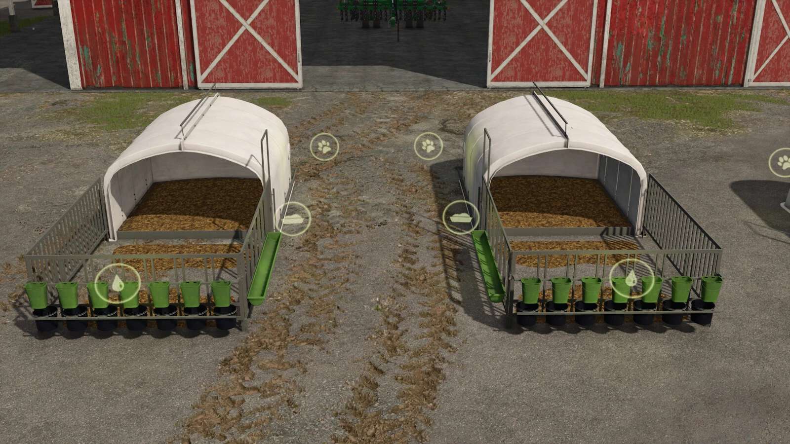 This pack consists of two group igloos and a single igloo for calves. The larger group igloos provide space for five and seven animals, respectively. Both group igloos feature numerous animations such as openable doors, toggleable drinking buckets, and more. Additionally, all variants can be filled with straw, allowing manure to be produced. This manure can be removed from the igloo via a trigger and transported to the manure heap.