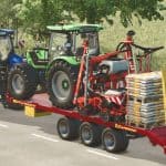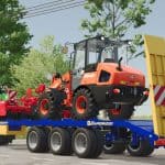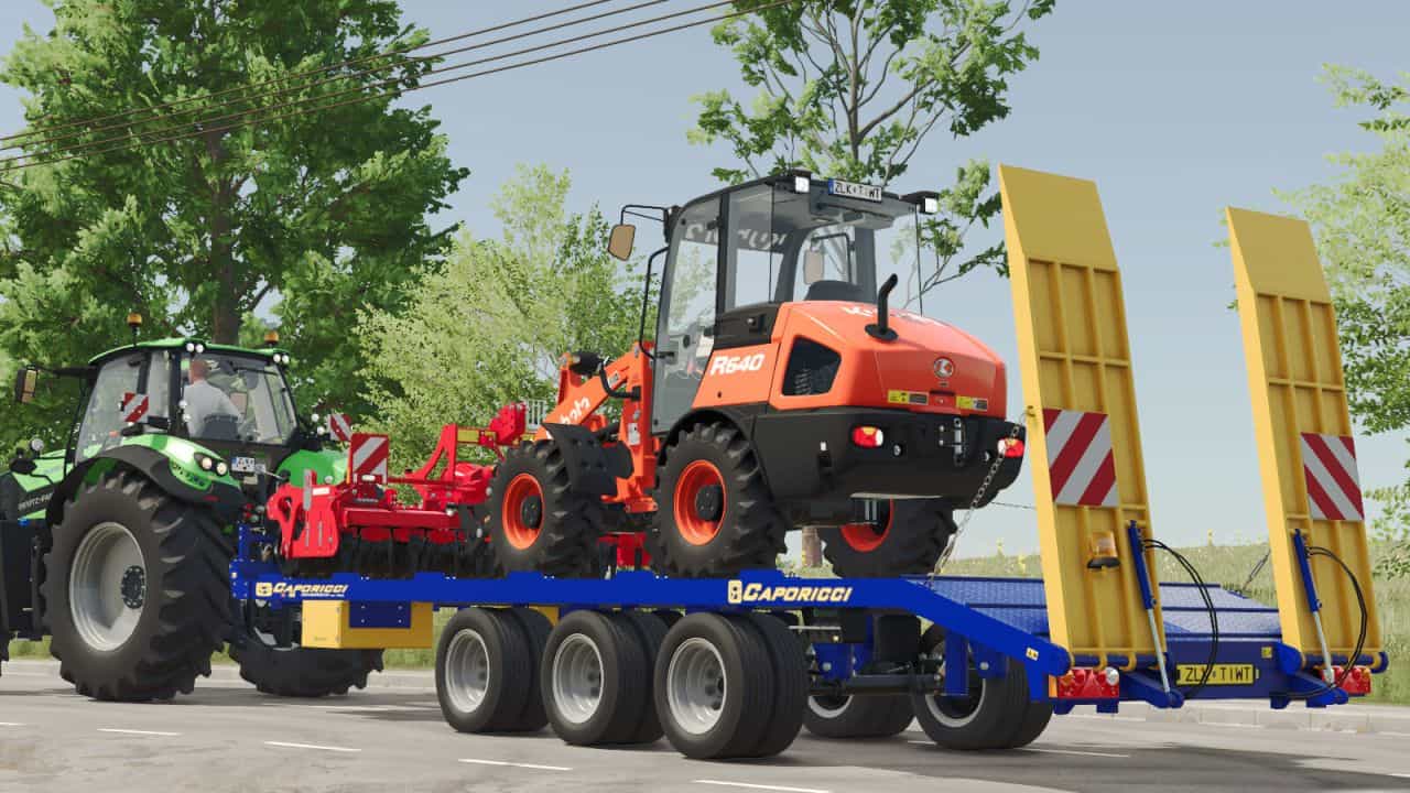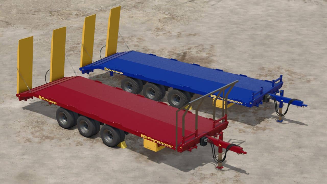 Caporicci FC260CR trailer for transport crawler tractors and bales – three axles and twin wheels – total capacity 200 Quintals Weight 5.900 kg – Length 9m – Width 2.50m – selectable automatic loading or manual loading.