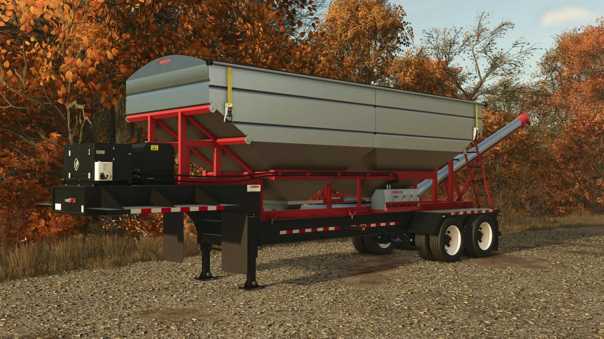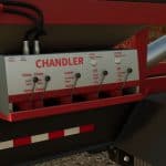 The Chandler 24-RDT (Rear Discharge Tender) is a 24-ton dry fertilizer tender. The two compartment, 304 stainless steel box sits on a trailer constructed of 32 foot long I-beams and can support 25,000 pounds on each leaf-spring axle.