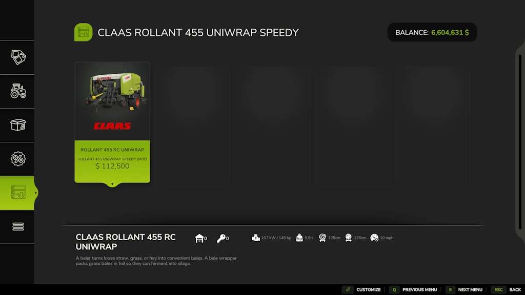 CLAAS ROLLANT 455 UNIWRAP Speedy v1.8 FS25 Mods | 15 Nov, 2025 CLAAS ROLLANT 455 UNIWRAP Speedy v1.8 Price: $112500 Required power: 145 hp Working speed: 17 kph Bale dimensions: 125cm Wrapped bale dimensions: 125cm Increased wrapping speed Optimized the file Changelog 1.8.0.0 Updated the moddesc Author: Adub Modding ABP Team This content was uploaded by our website visitors. If you notice any errors, please let us know.