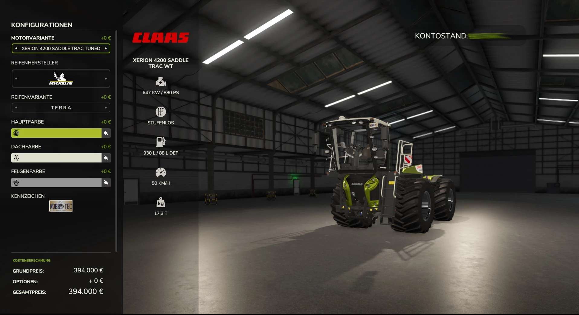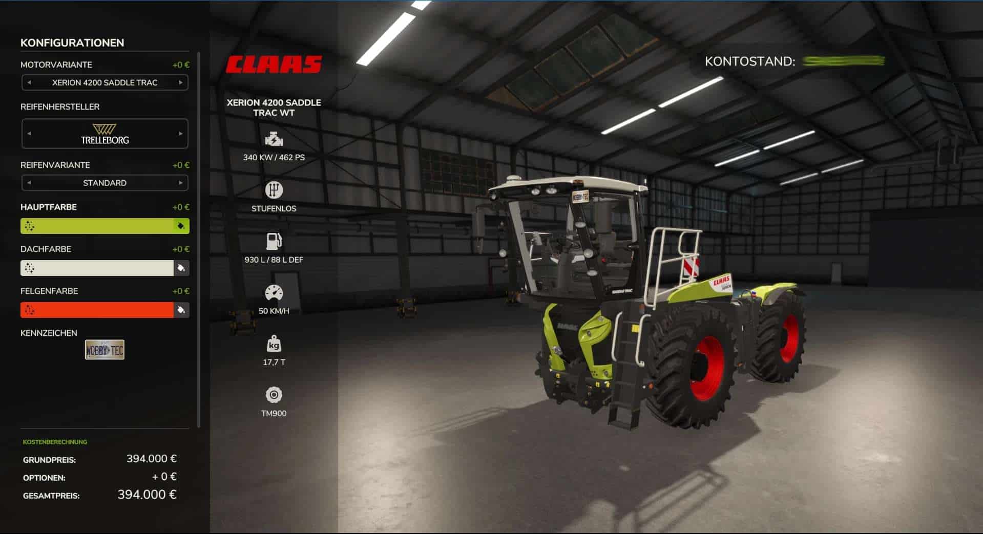 – Color selection adapted (Claas Grün Metallic as the only default color in metallic)