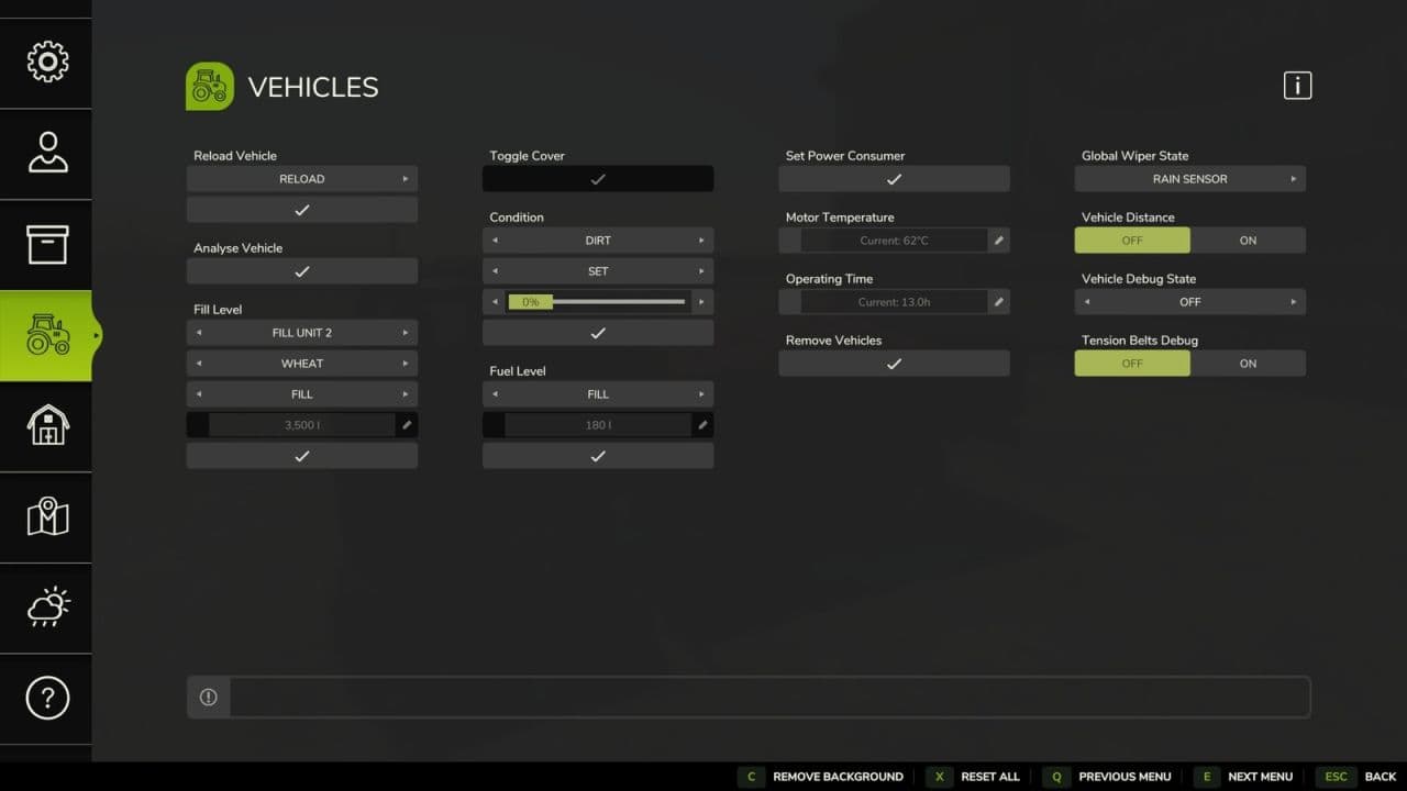 – [Vehicles] Added ‘Vehicle Selection’ feature, allowing implement selection change when vehicle is entered without leaving menu, useful when refilling multiple trailers etc.