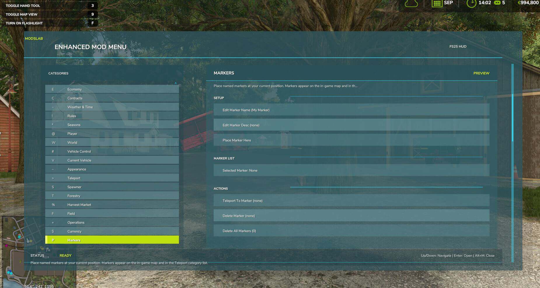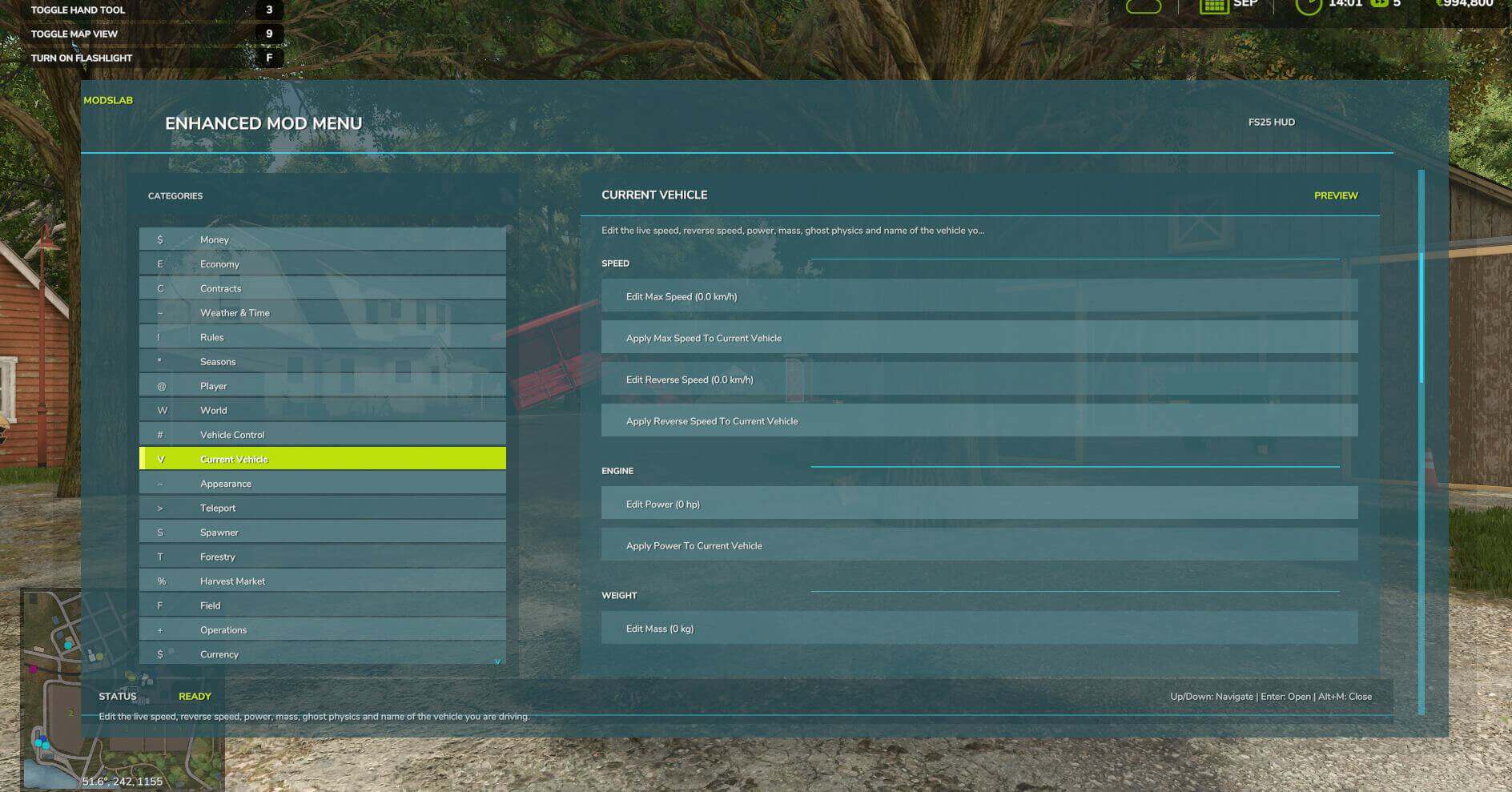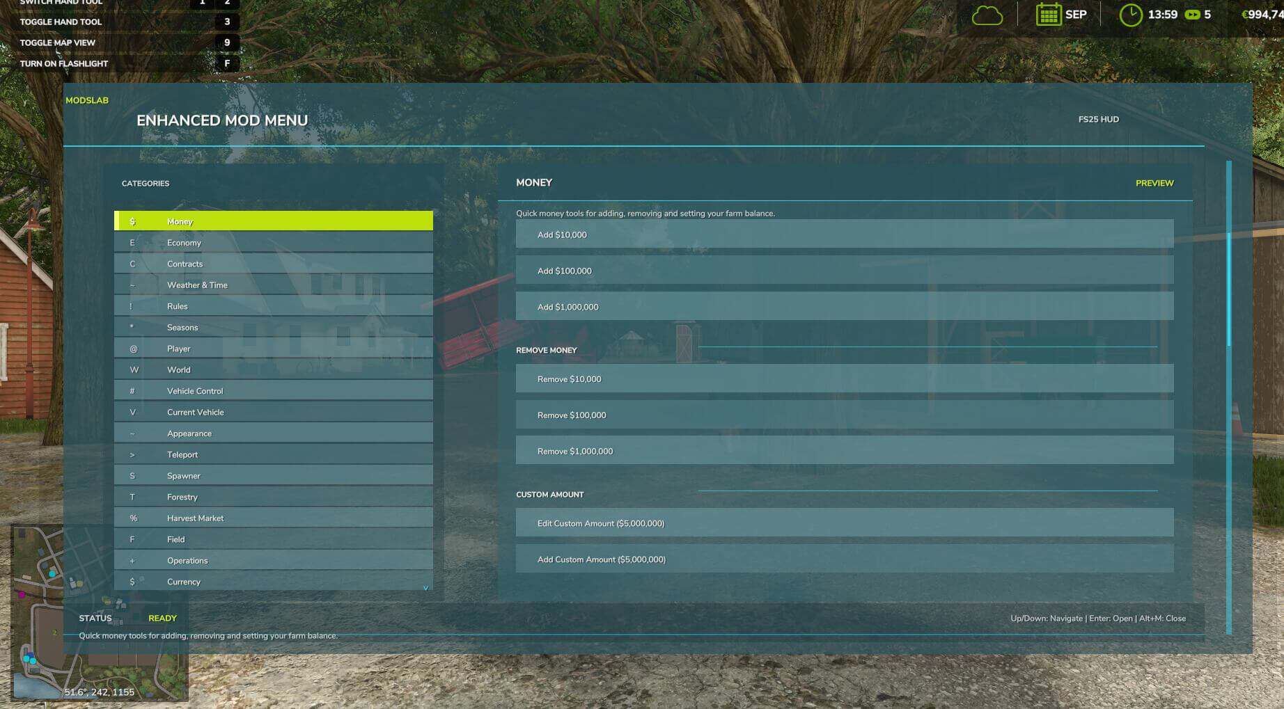 This FS25 modification adds a mod and cheat menu with a huge range of functionality. Dozens of features are available.