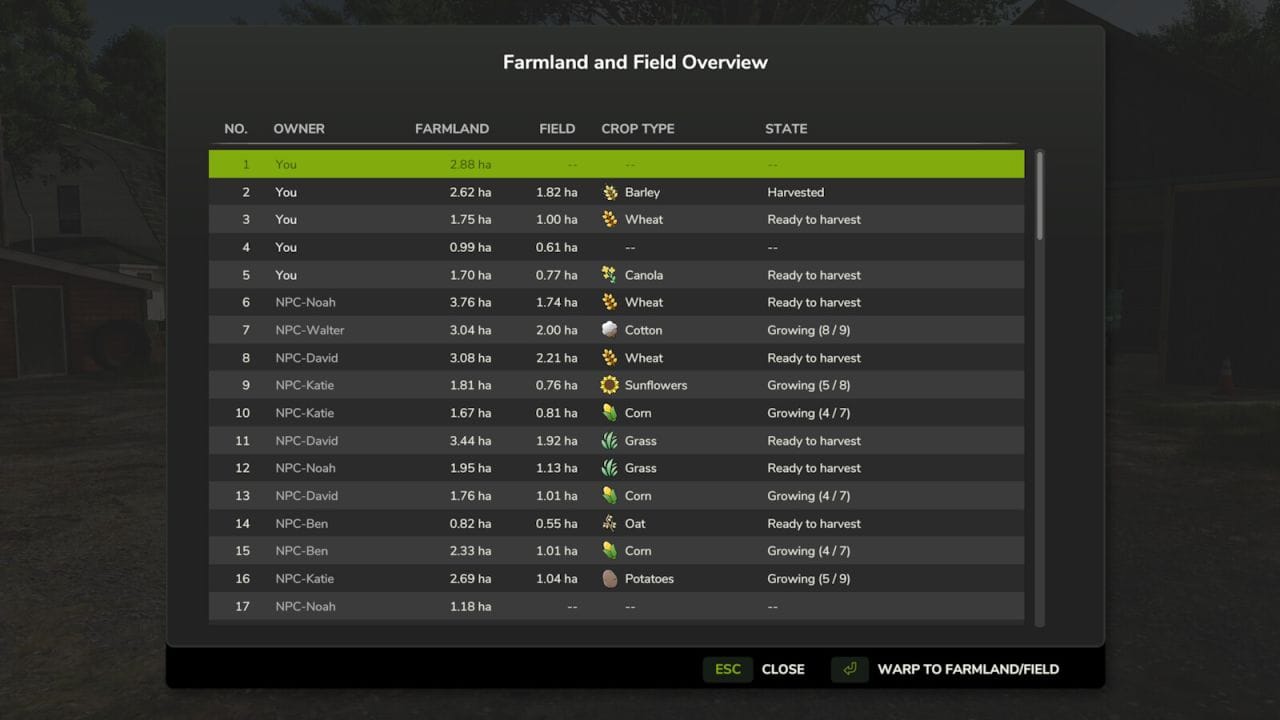 With this MOD you can quickly get an overview of all farmlands and fields. Your own fields are displayed first. You can also teleport directly to a farmland/field.