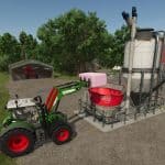 Mixed feed system for total mixed ration. The mixing plant can be loaded with a front loader and bales directly into the mixing bucket or loose material at the front of the plant; the end product is a total mixed ration like from classic feed mixer wagons.