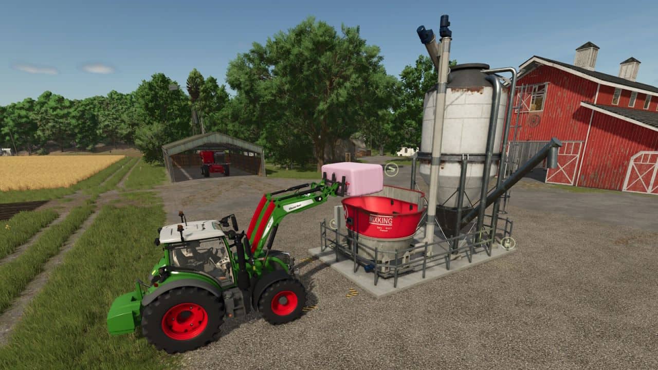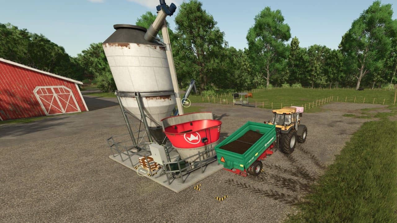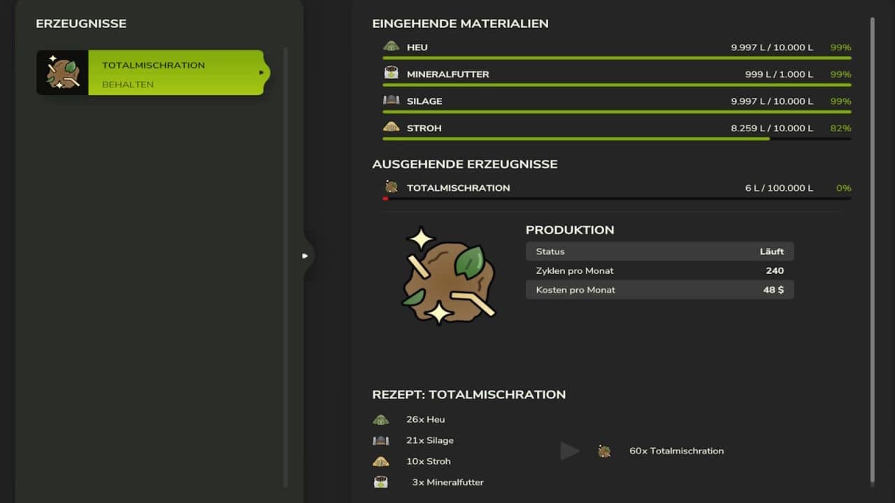 Mixed feed system for total mixed ration. The mixing plant can be loaded with a front loader and bales directly into the mixing bucket or loose material at the front of the plant; the end product is a total mixed ration like from classic feed mixer wagons.