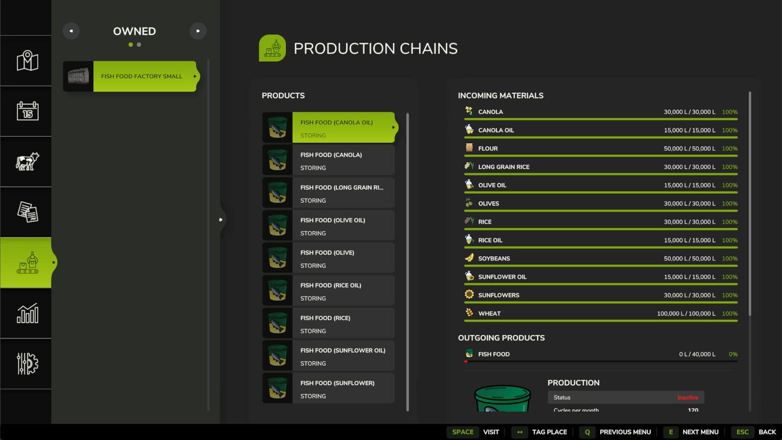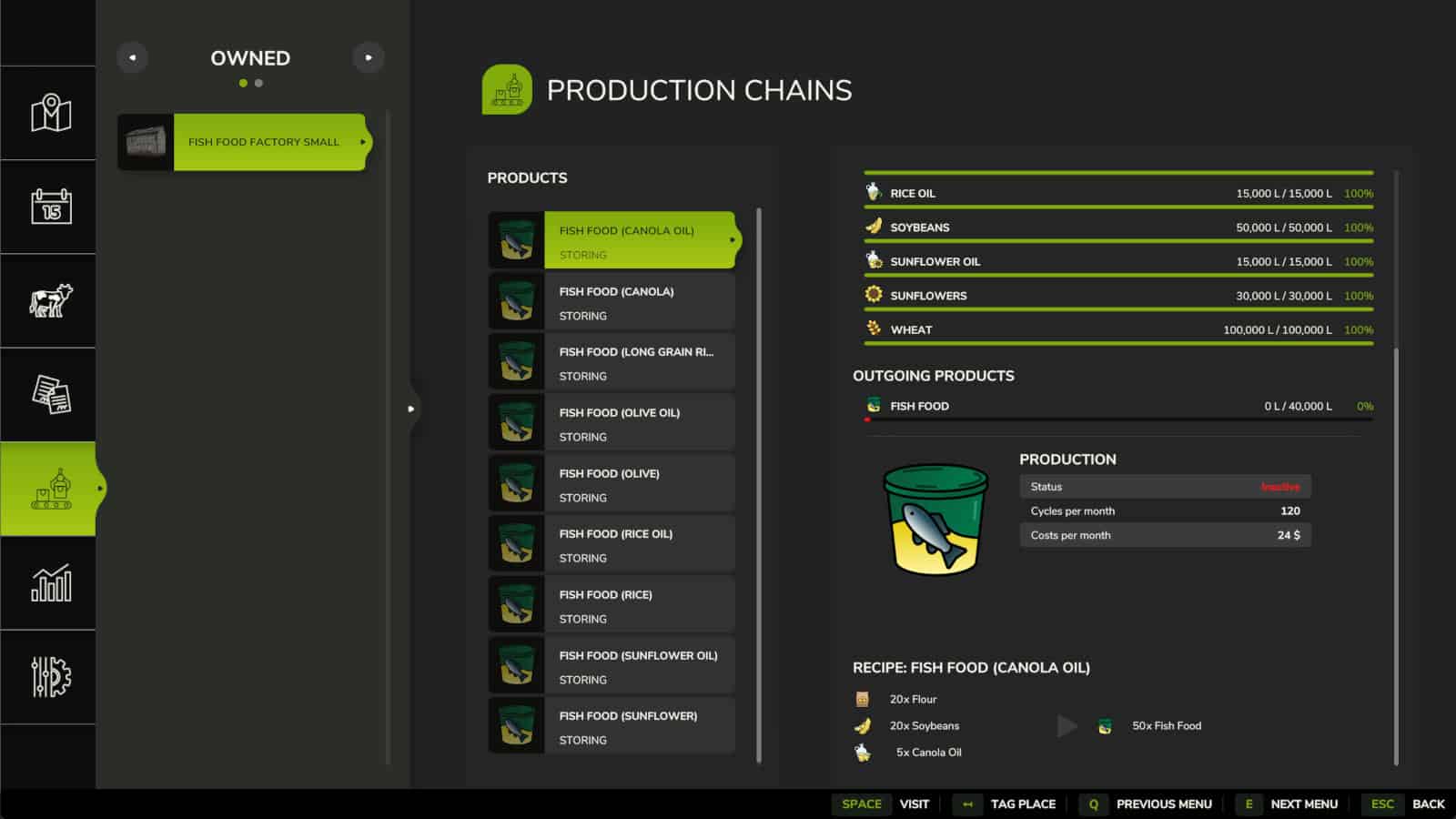 Small fish food factory for your farm. You will have to option to make fish food with or without flour and oil. If you choose to make the options without then you will need to substitute wheat for the flour and the appropriate crop in place of its oil.