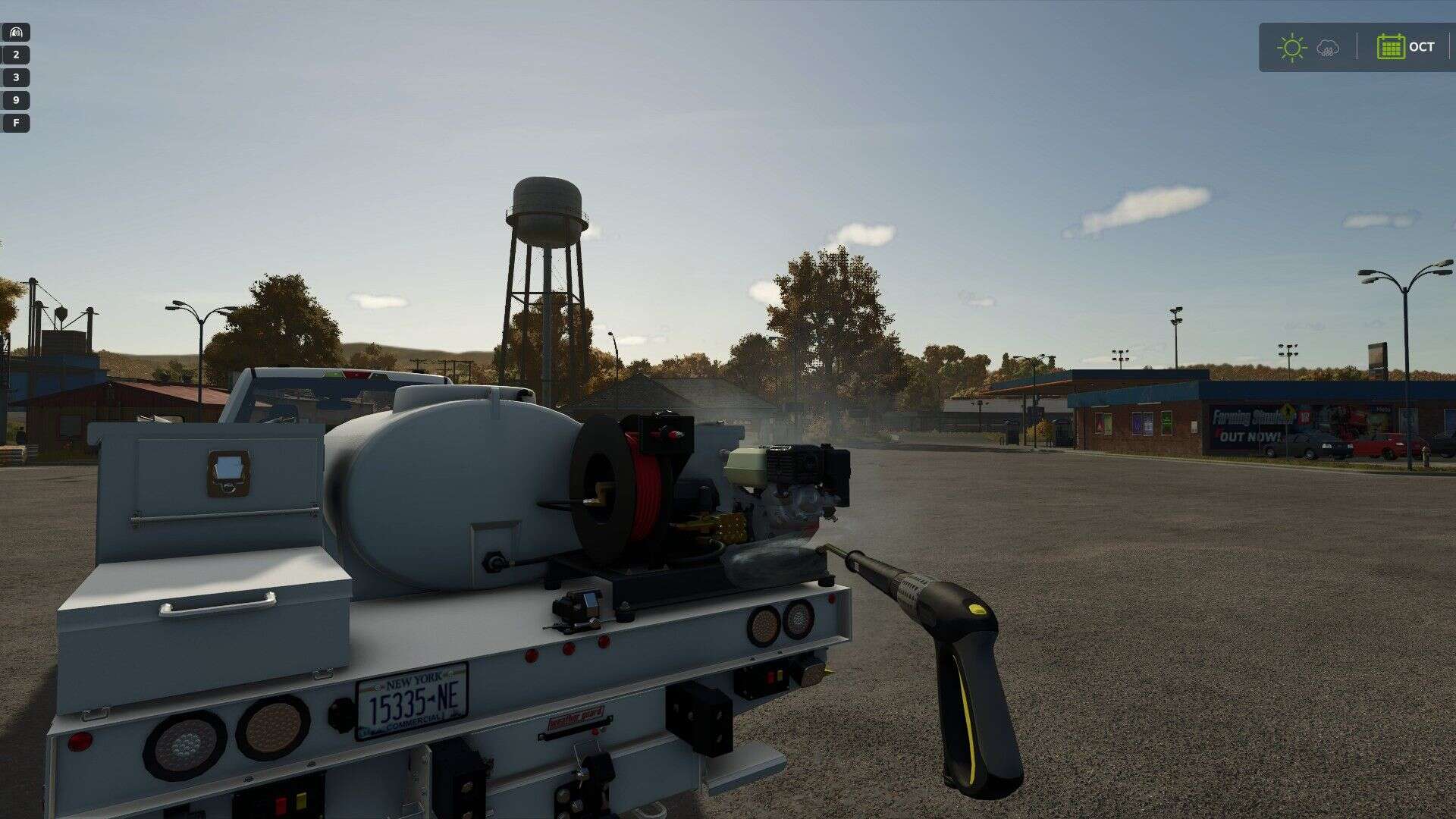 This truck has a 4000 PSI pressure washer on the rear right corner of the service body, along with a water tank in the bed. This pressure washer has a Honda GX390 with electric start. You can use it by selecting the option in the store to add the pressure washer, filling the truck with water, walking up to the hose reel at the back of the truck, and press R to turn on the pressure washer. You can also adjust the pressure to your liking.