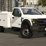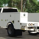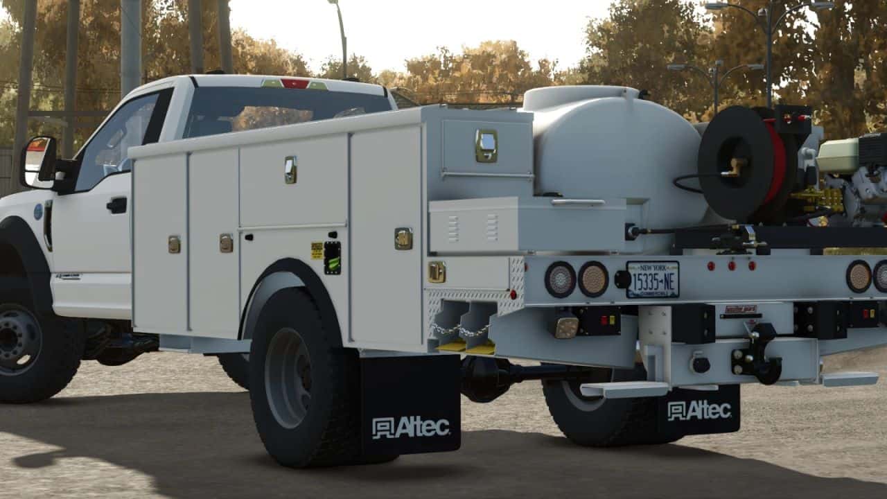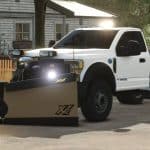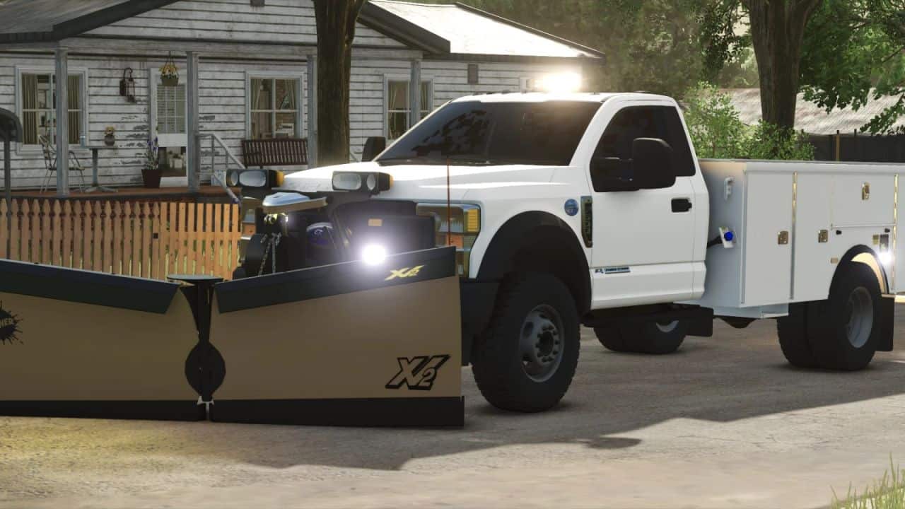 This truck is compatible with the Western Wide Out plow. There’s a laptop in the toolbox above the left rear wheel. Press M to open the laptop and activate the service function. Here you can repair and customize your vehicles. To use the shovel, you must first extend the outriggers.