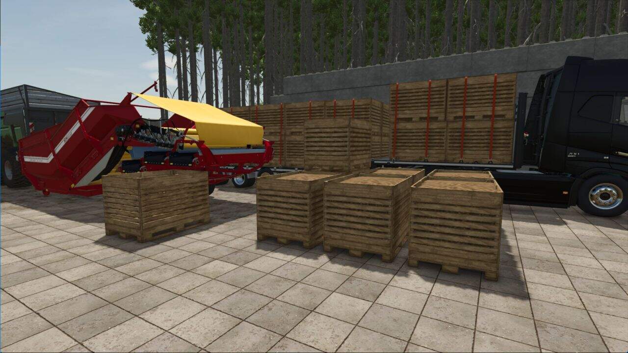 Each box is based on the base-game Dewulf vegetable pallet and holds up to 2,000 liters. The box also has a fillTrigger so can be used to fill implements. The palletizer is fully compatible with shed storage triggers and checks per-slot occupancy before placing a new box. This allows continuous operation together with mods such as Universal Autoload, which can empty the pallet grid dynamically.