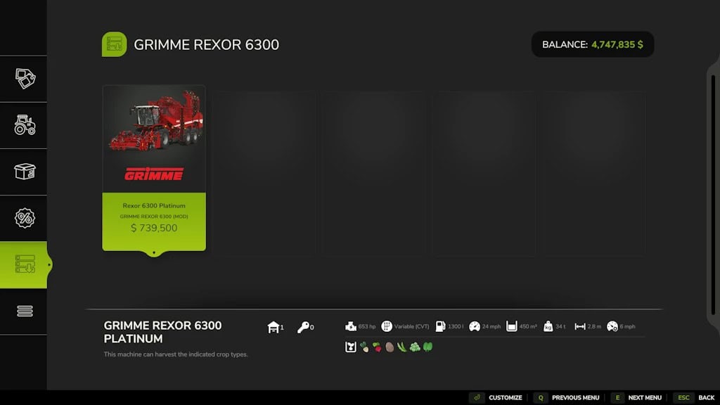 Grimme Rexor 6300 v2.1 FS25 Mods | 28 Feb, 2026 Grimme Rexor 6300 v2.1 – Price: $739500 – Power: 653 hp – Max. speed: 40 kph – Capacity: 450000 – Optimized the file – Harvest all rootcrops now and vegetables – Increased capacity Changelog 2.1.0.0 – Added window tint configs Author: Adub Modding ABP Team This content was uploaded by our website visitors. If you notice any errors, please let us know.