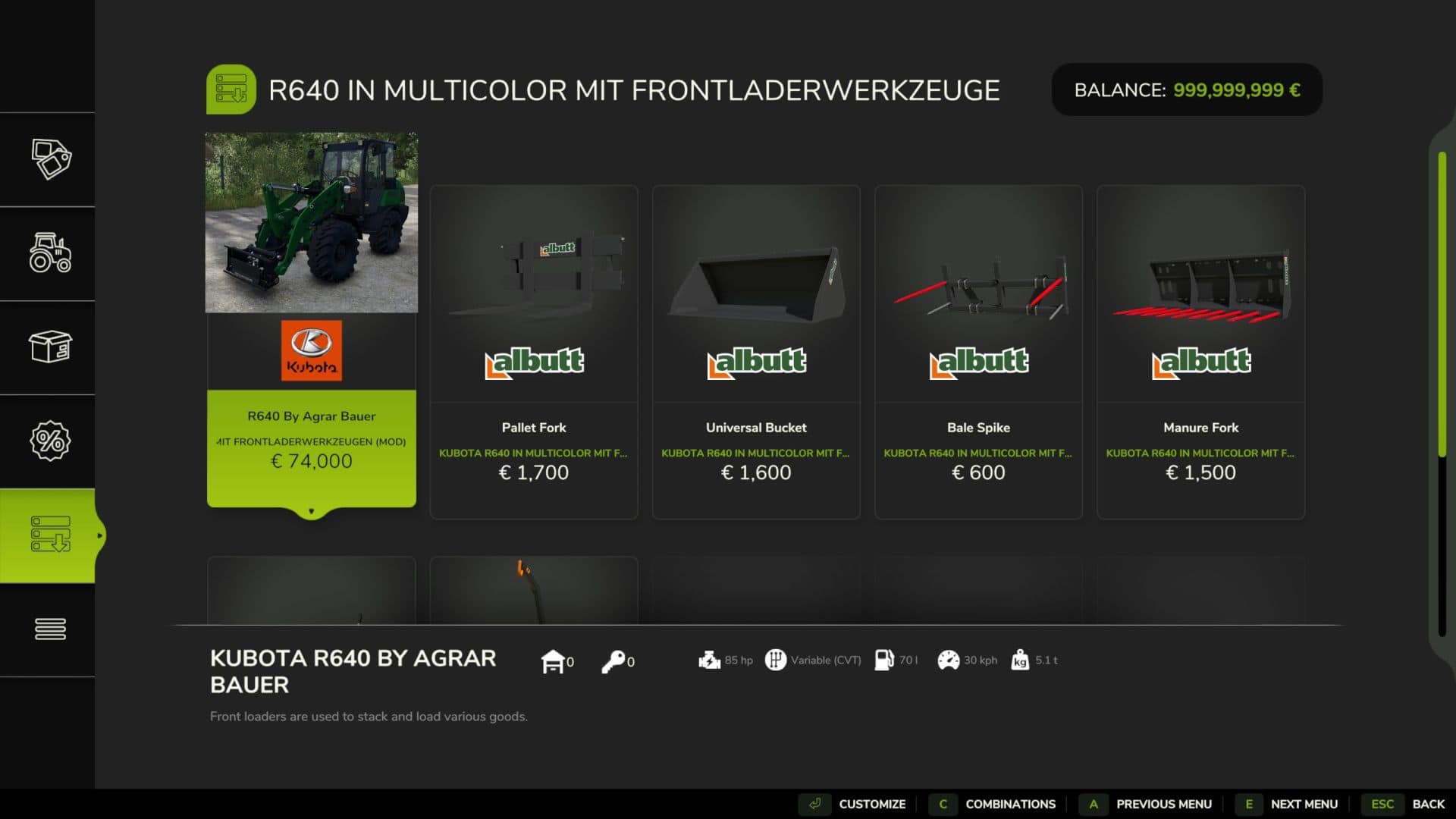 – Front loader manure fork in multicolor and you can configure the liter capacity from 1000l – 5000l