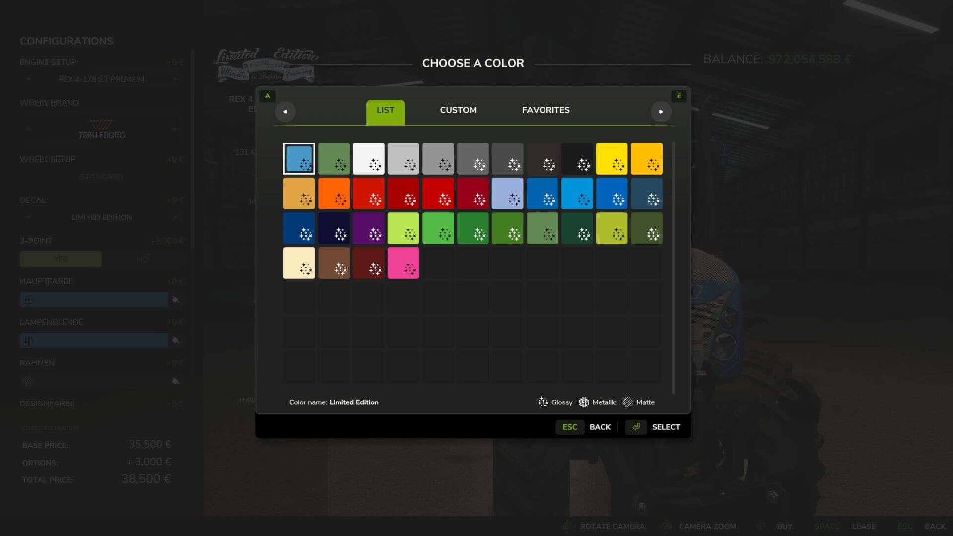 – Color choices for main color, headlight bezel, frame, design color, interior design, interior design 2, interior design 3, engine decal, grid, and rim color.