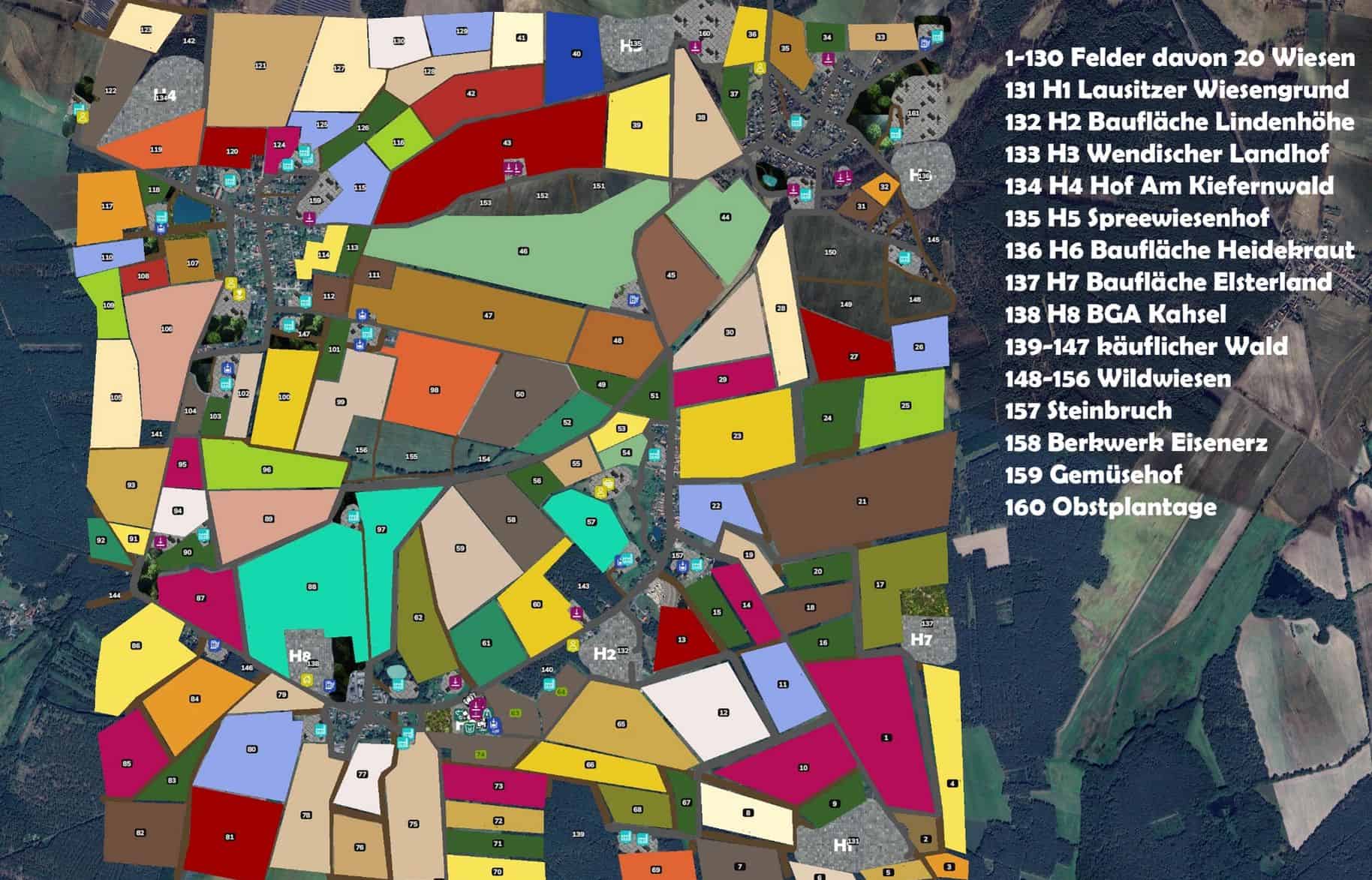 – 4 farm buildings, 2 building plots, 1 BGA, 1 vegetable farm, 1 orchard