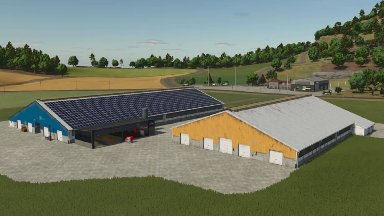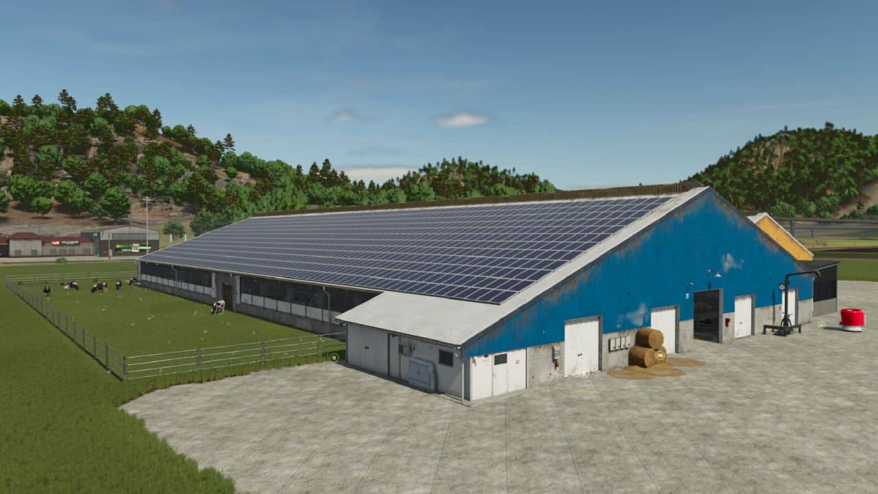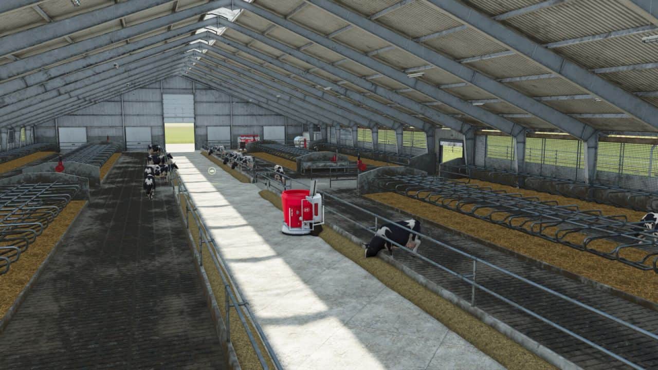 Cow barns with small outside pastures. 2 size variants and both has also variant with feeding robot and variants without pasture, 8 placeables in this pack in total. Also included in this pack is special cow fence for these barns. This fence can be placed down also as standalone object – separately from the barn.