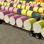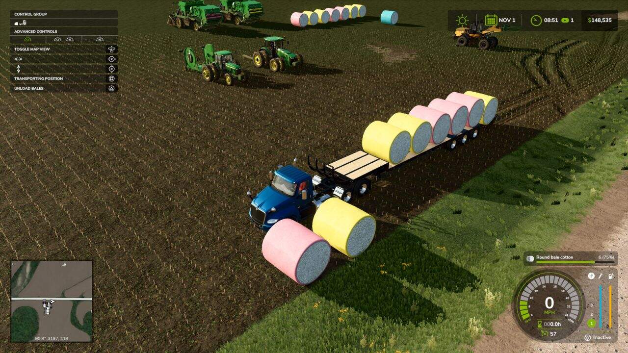This mod also has a self-loading store configuration and will pick up eight modules automatically when driven close to them. To start the autoload function, enter operating postion and drive near the cotton modules. Once they are all loaded up you can enter transport mode and the modules will stay on the trailer no matter how crazy you drive (as long as you don’t reset the trailer!).