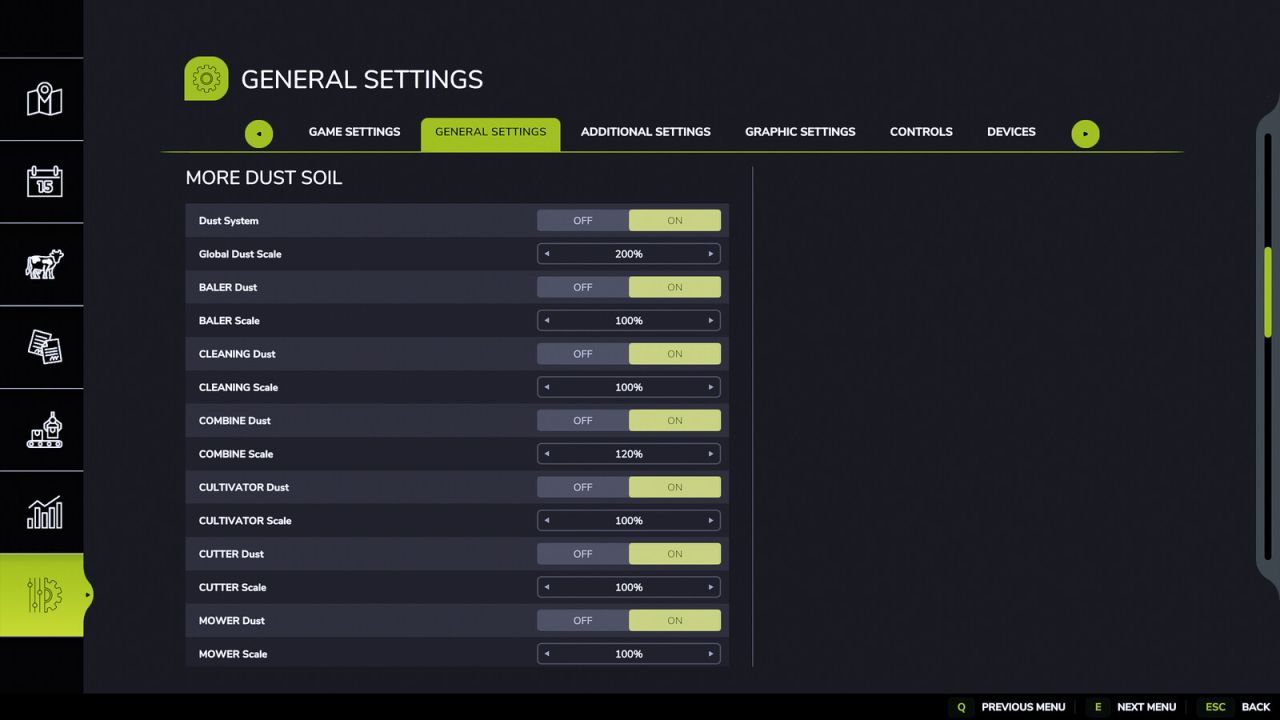 What truly sets this modification apart is its highly customizable, granular control system. It features dedicated settings for every single tool and implement, allowing you to fine-tune the dust levels individually or turn the effect completely off for specific equipment. For maximum convenience, a master toggle is also included, letting you disable the entire mod with a single click whenever necessary. This unparalleled flexibility ensures your equipment behaves exactly the way you want it to, making it a perfect addition to your mod folder.