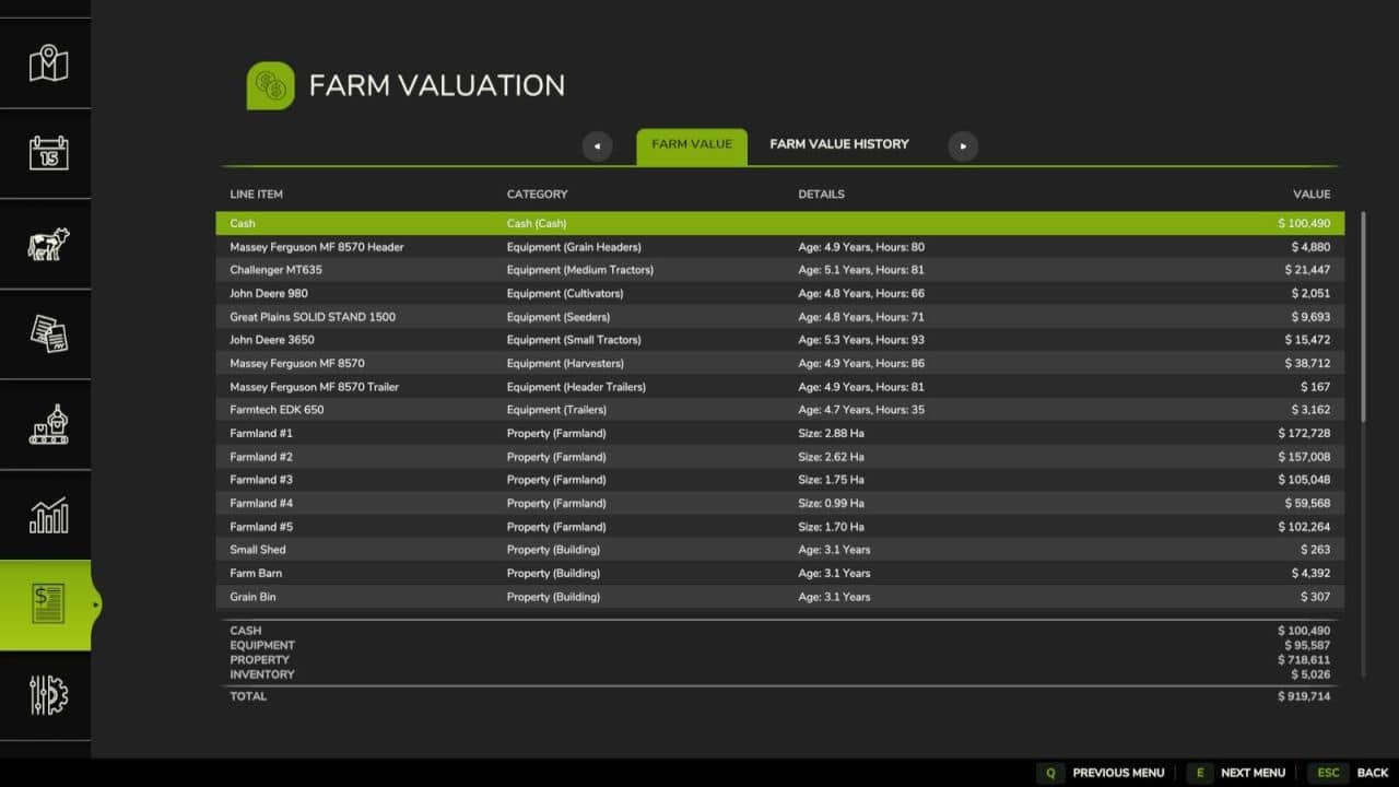 Adds menu screen with a tab to sumarize your farms total value in a balance sheet and a history tab to summaries the history of your farms value.