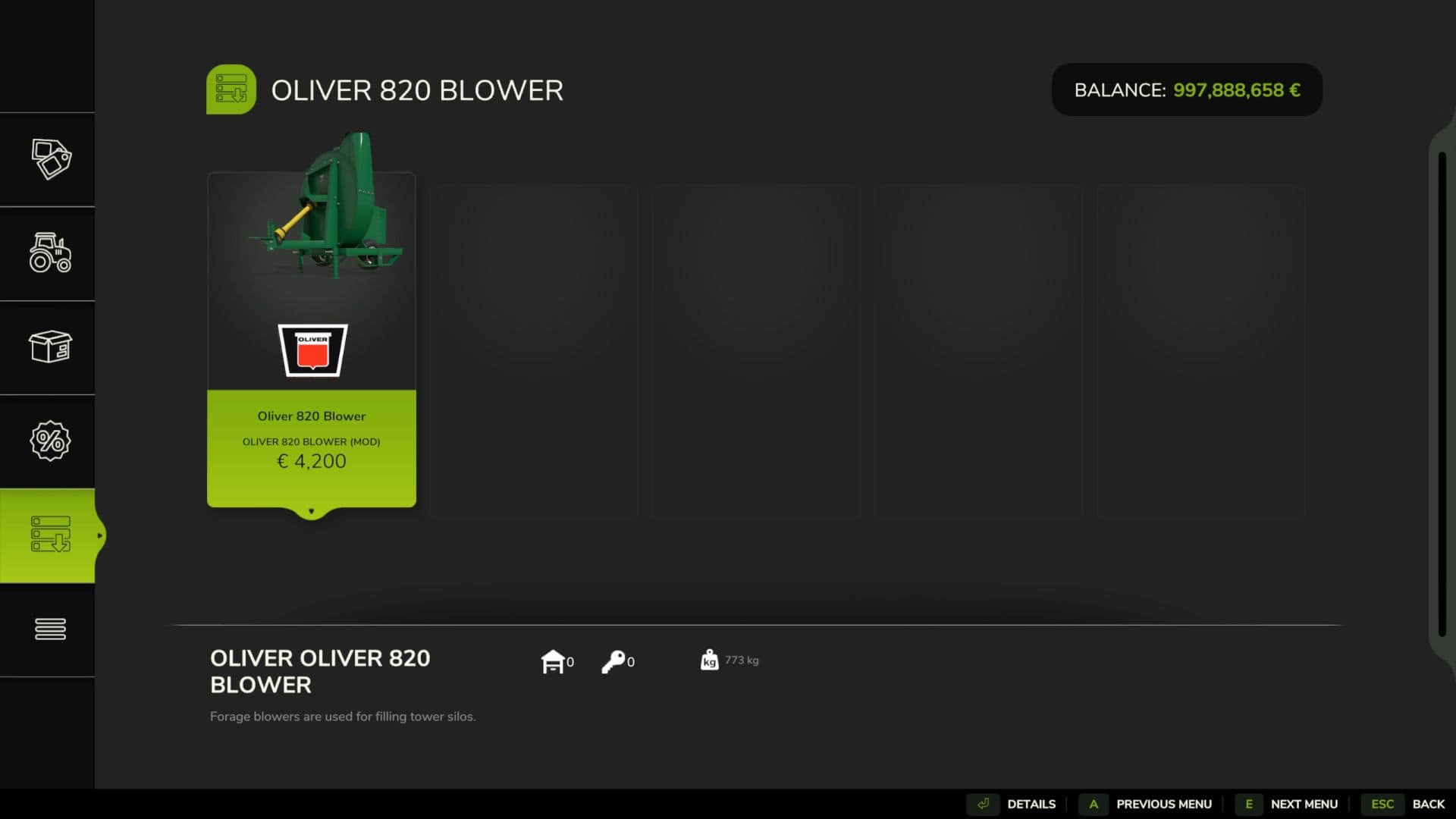 Oliver 820 SilosBlower v1.0 FS25 Mods | 30 Nov, 2025 Oliver 820 SilosBlower v1.0 A good old fashionned silo blower from Oliver, the 820. – Price : 4.200€ Author: CanadianPhoenixModding This content was uploaded by our website visitors. If you notice any errors, please let us know.