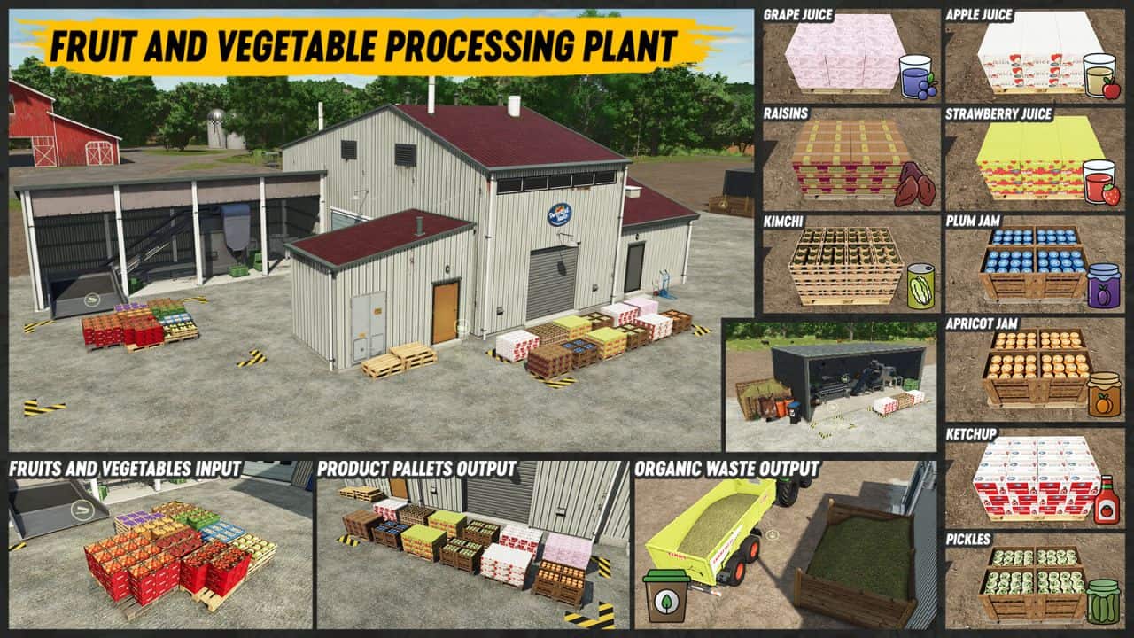 – All products in this pack are included in PRODUCT and SELLINGSTATION_PRODUCTSFOOD fillTypes categories so any selling station on any map acceping this categories will accept also products from this pack.
