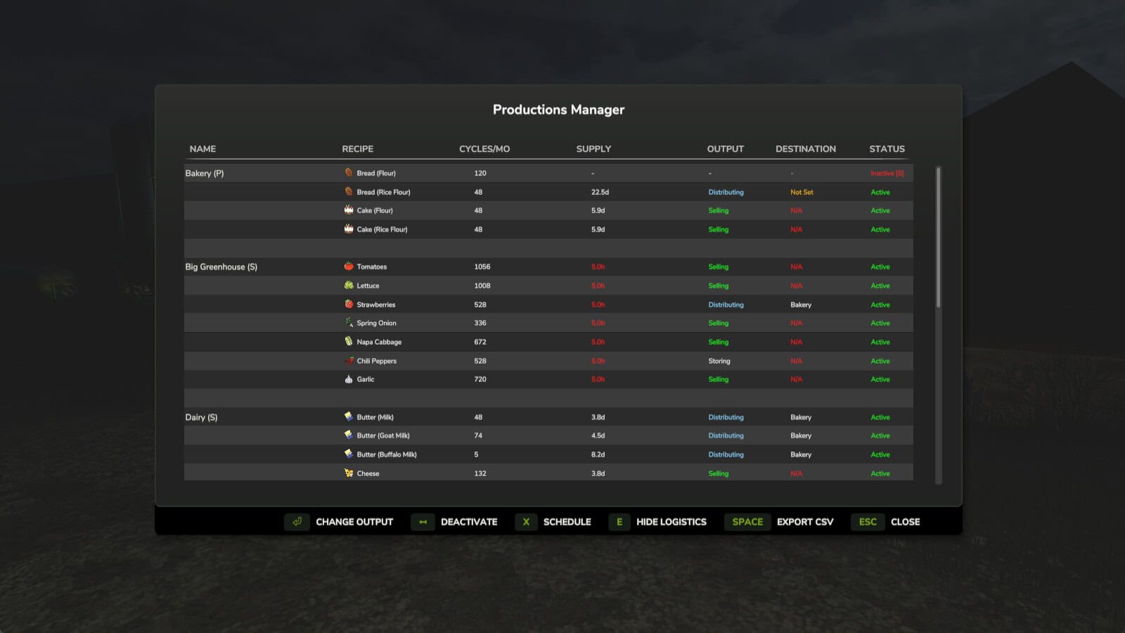 – Logistics Page: Overview of all production’s and their recipies includes, Supply Duration, Cycles/MO, Output Mode, Location, Status
