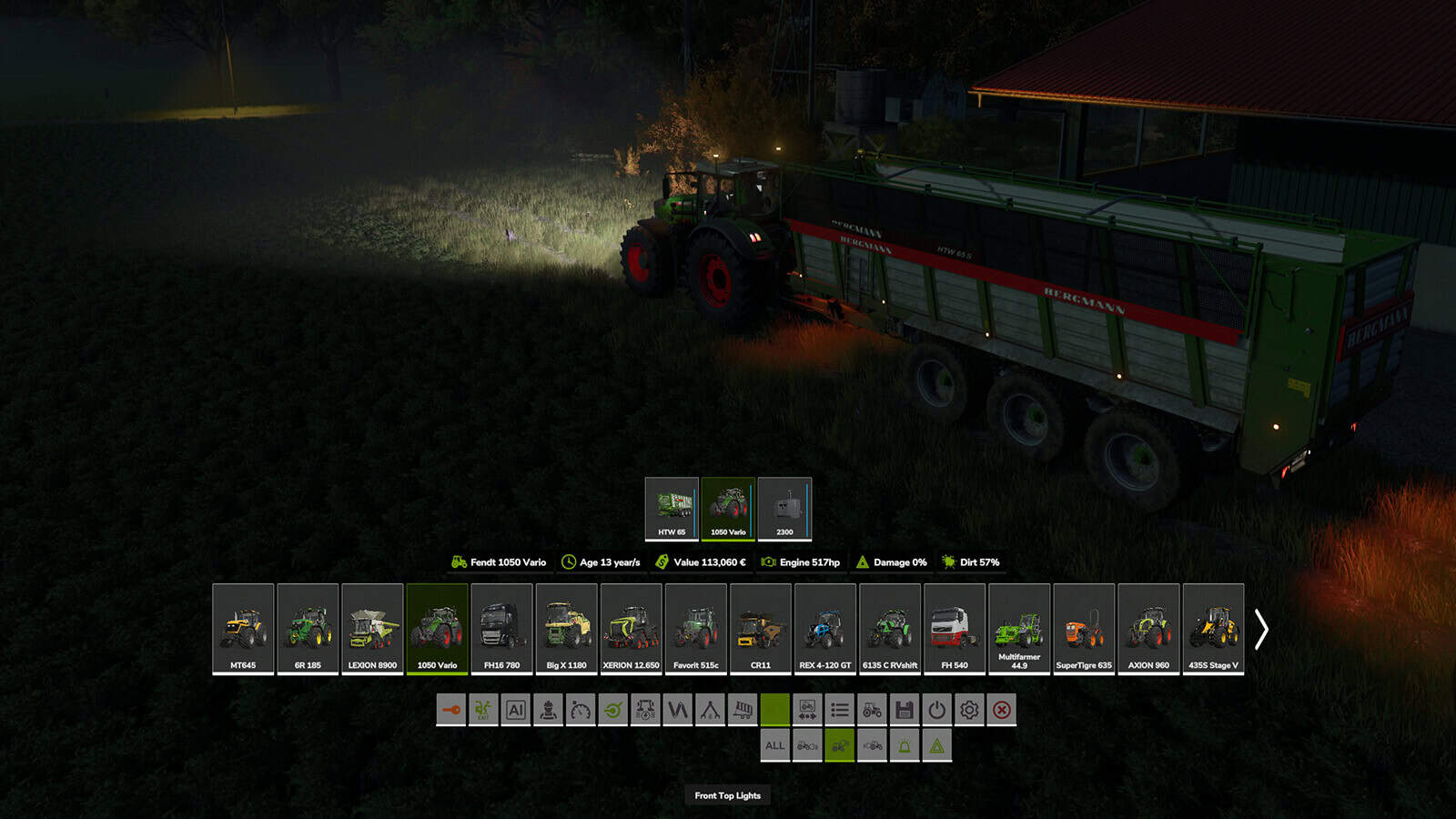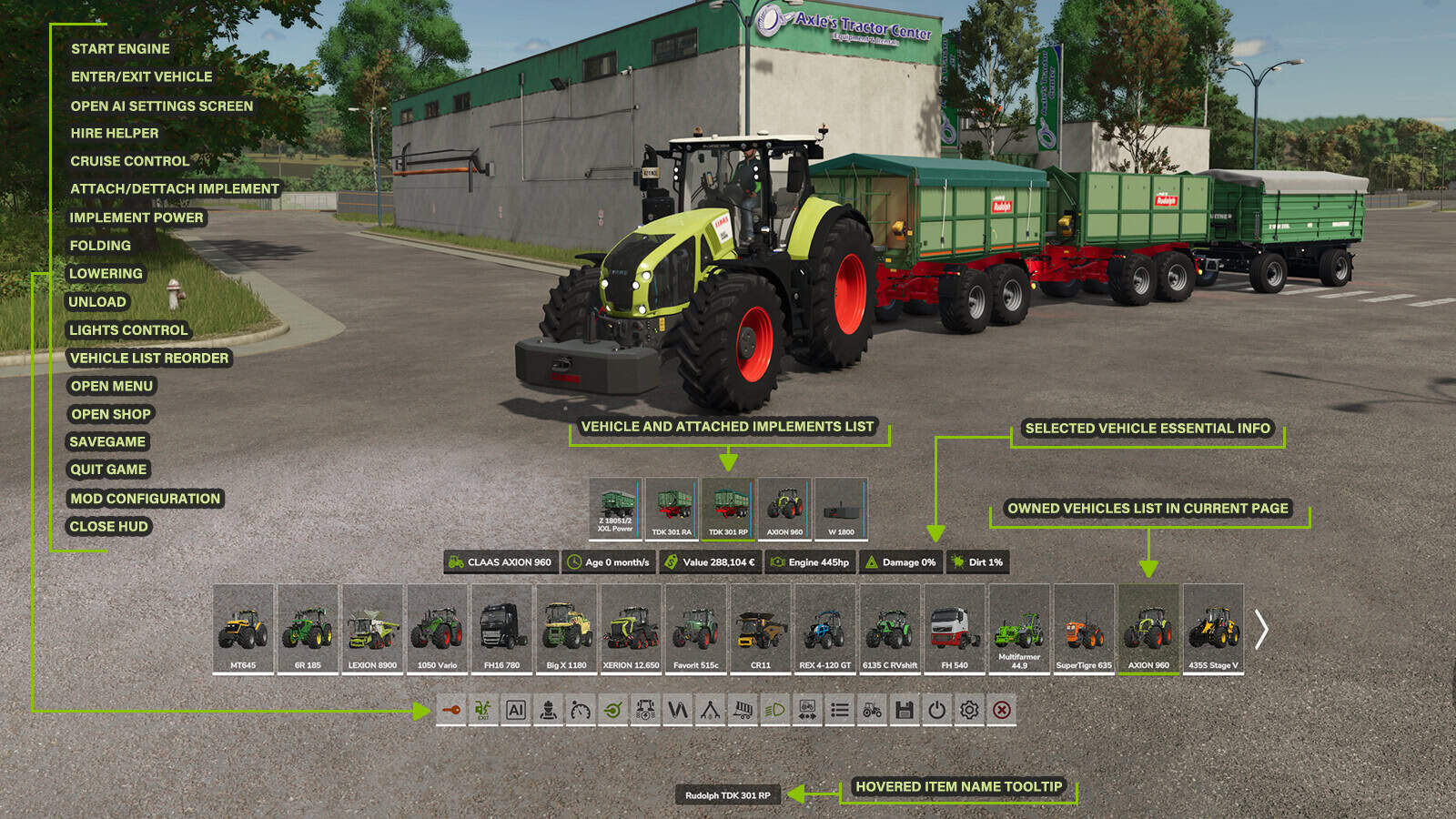 – Selectable Vehicles: Paginated list of owned vehicles and attached implements