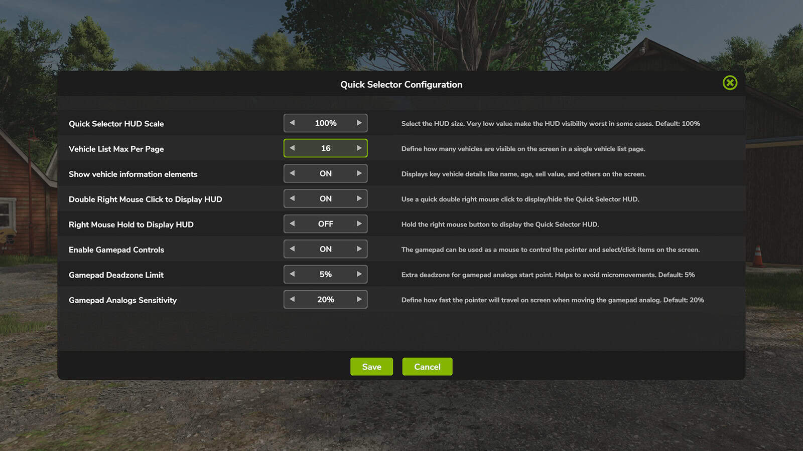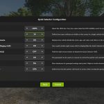 The Quick Selector enhances gameplay with an intuitive user interface, offering additional game functions and quick access to essential vehicle and game controls. It features the list of personal vehicles and implements, additional vehicle information and the possibility to operate selected vehicle/implement functions with a click.