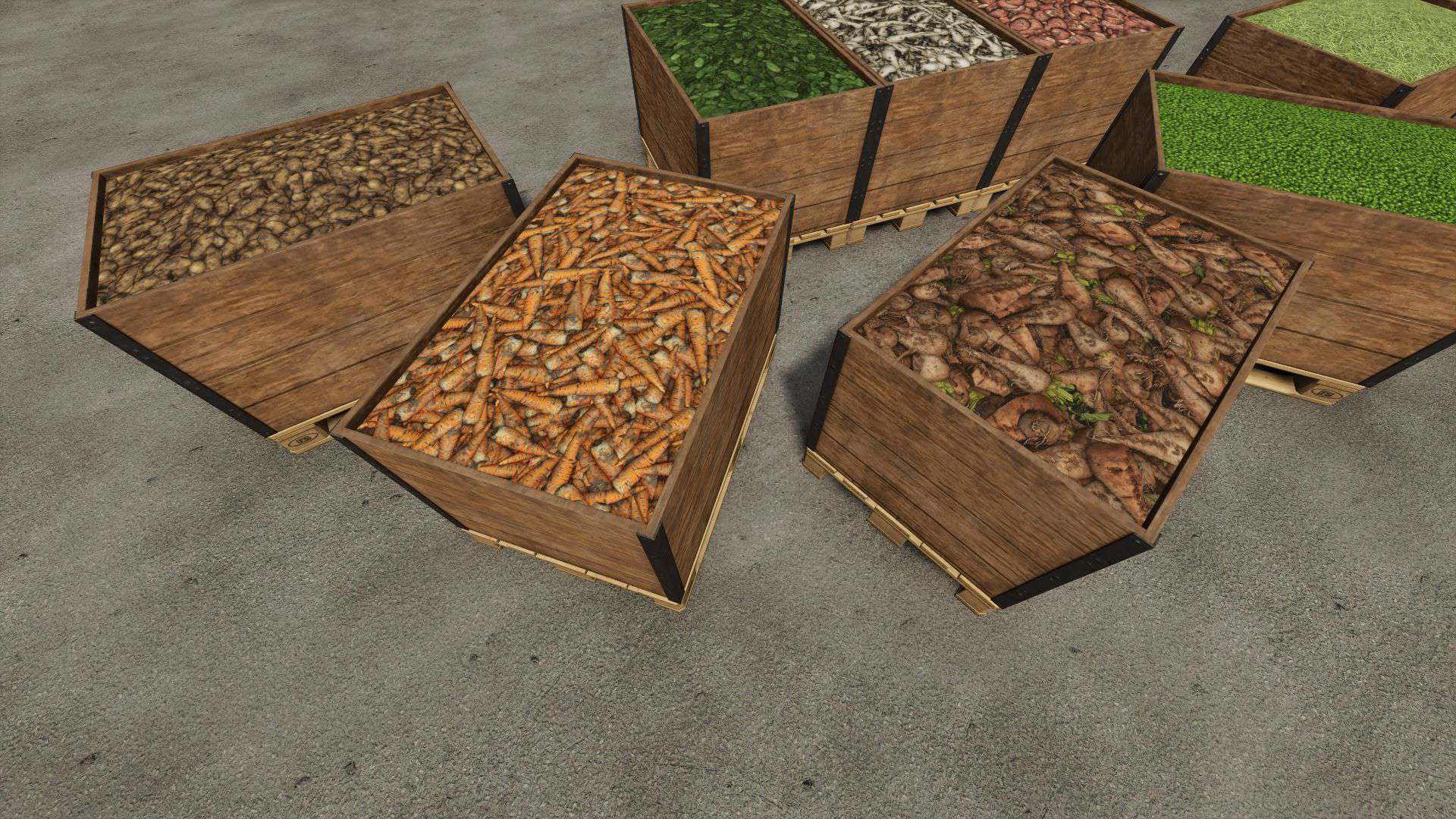 It create pallets for potato sugarbeet carrot beetroot parsnip greenbean pea spinach. Can be used with mine other harvesters mods.