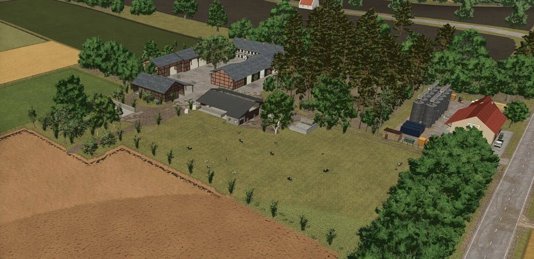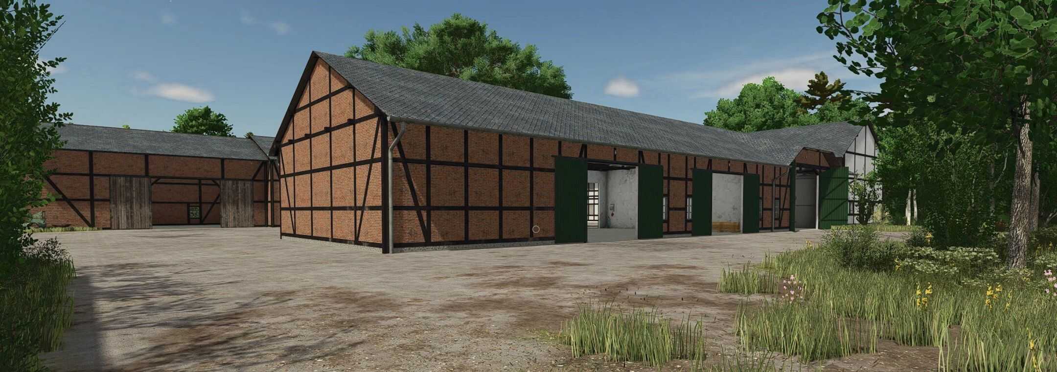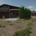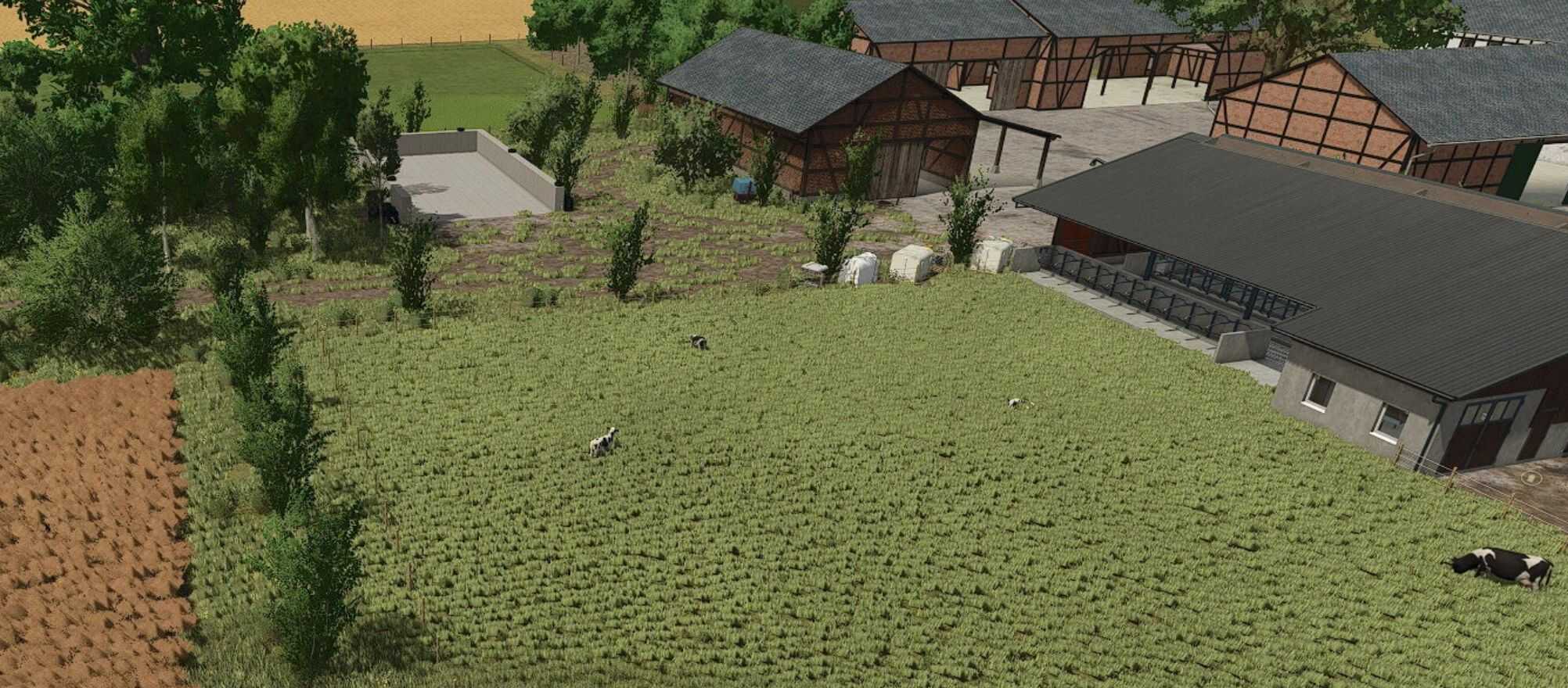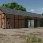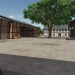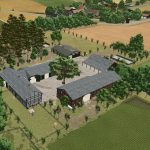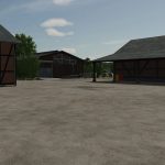 A cowshed for a maximum of 95 cows, two timber-framed sheds for machinery, a farmhouse with a built-in silo and barn, a drive-through silage clamp, and a manure heap. This is a savegame for Ka77e’s home. I built a dairy farm in the north of the map. The farm is in a timber-framed style and suitable for small to medium-sized machinery.