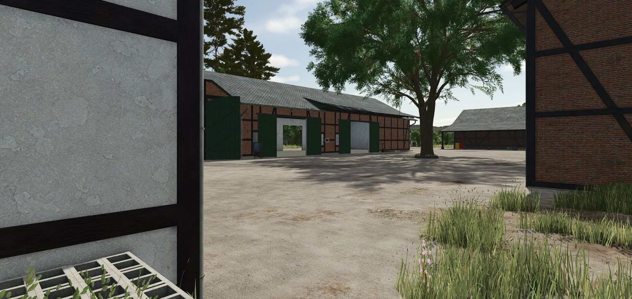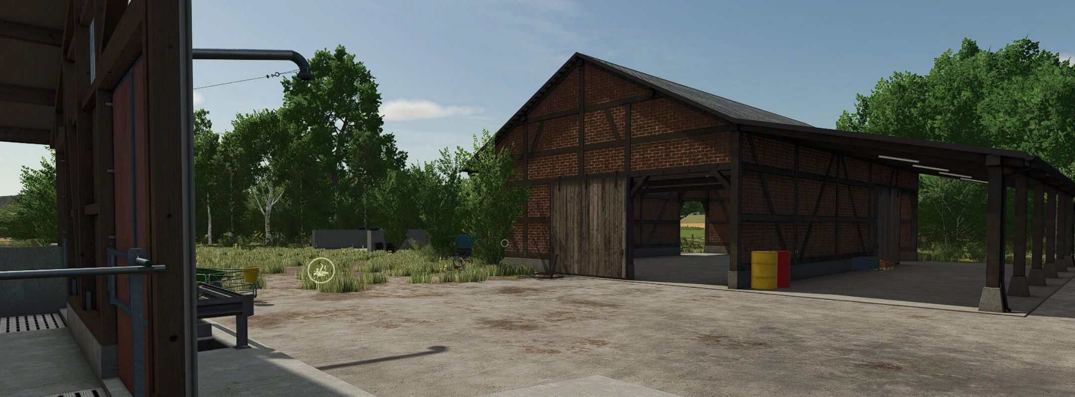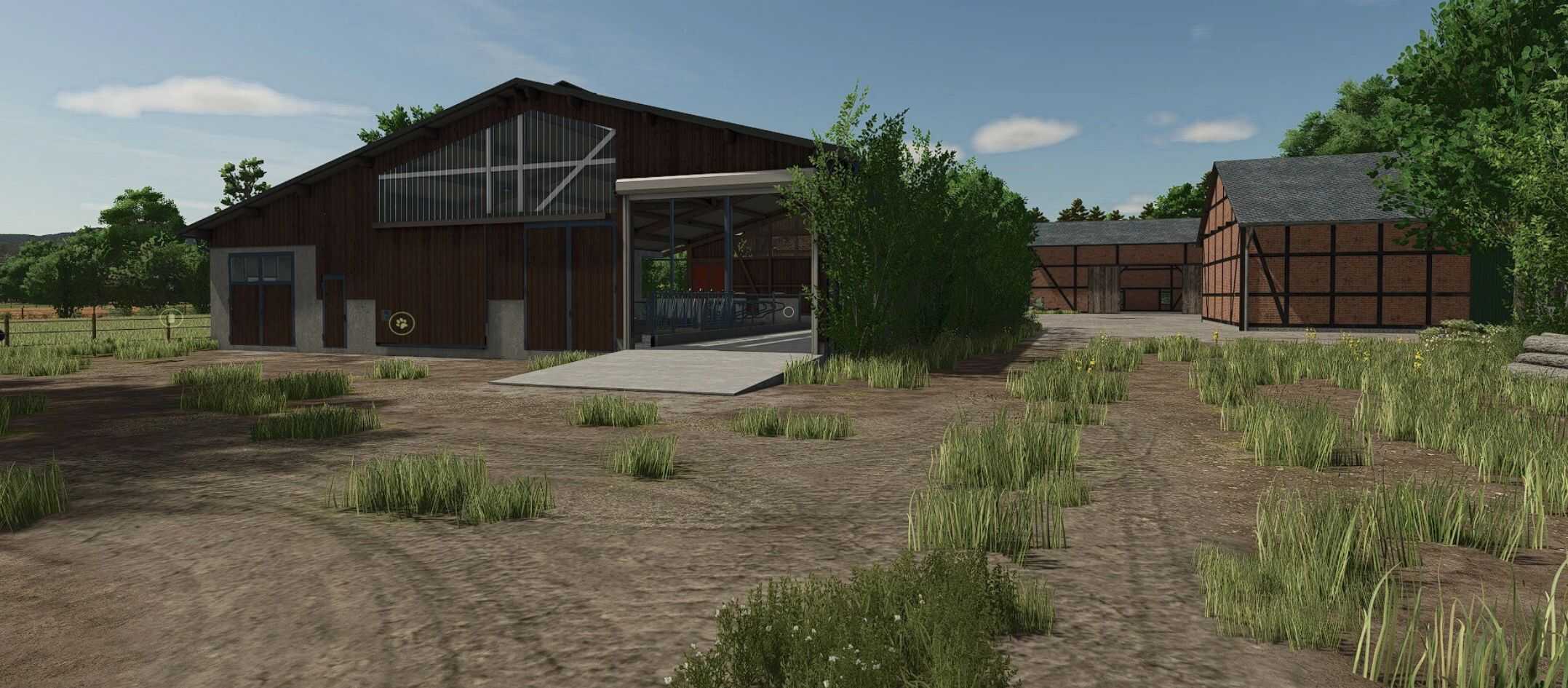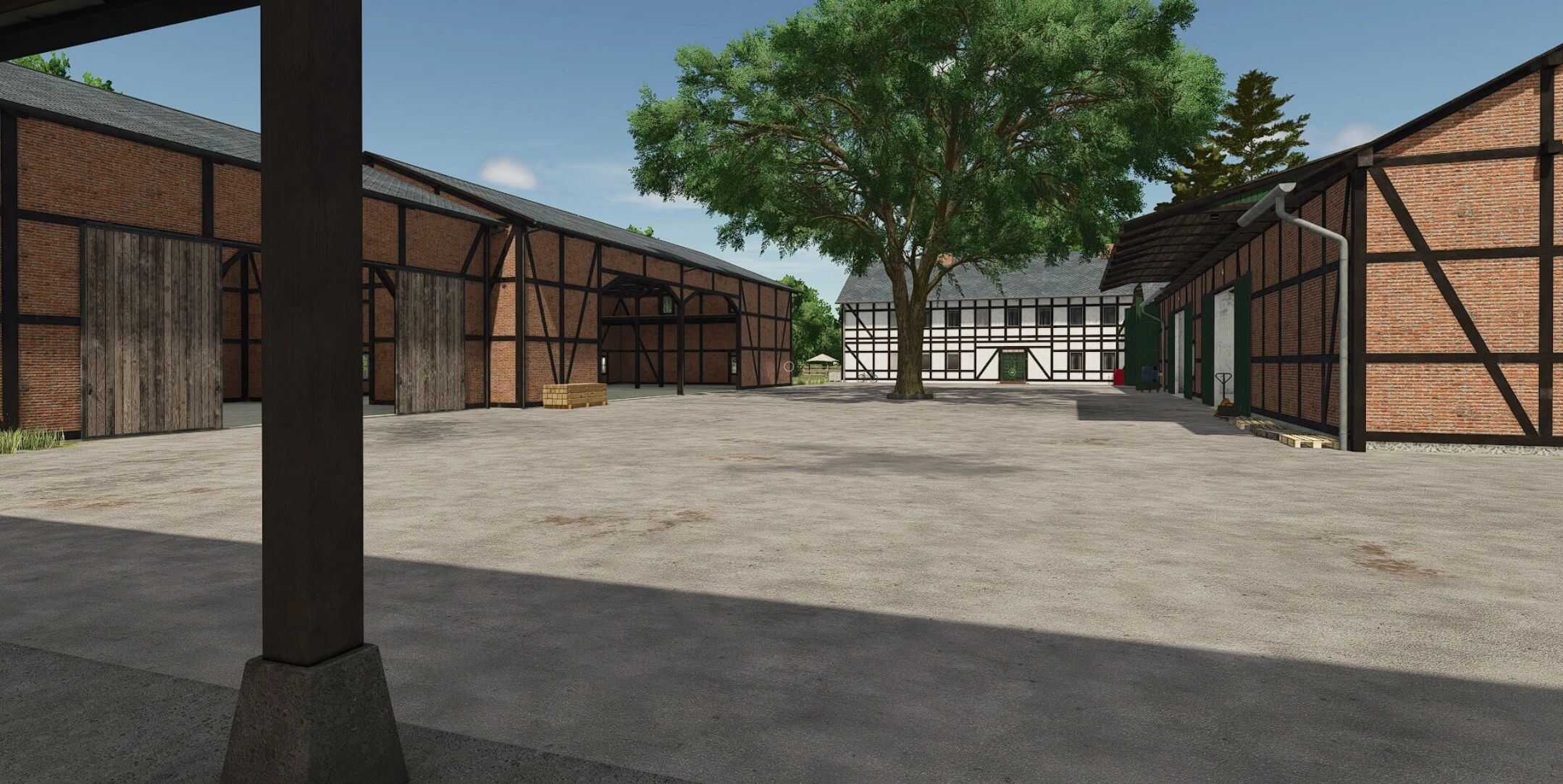 A cowshed for a maximum of 95 cows, two timber-framed sheds for machinery, a farmhouse with a built-in silo and barn, a drive-through silage clamp, and a manure heap. This is a savegame for Ka77e’s home. I built a dairy farm in the north of the map. The farm is in a timber-framed style and suitable for small to medium-sized machinery.