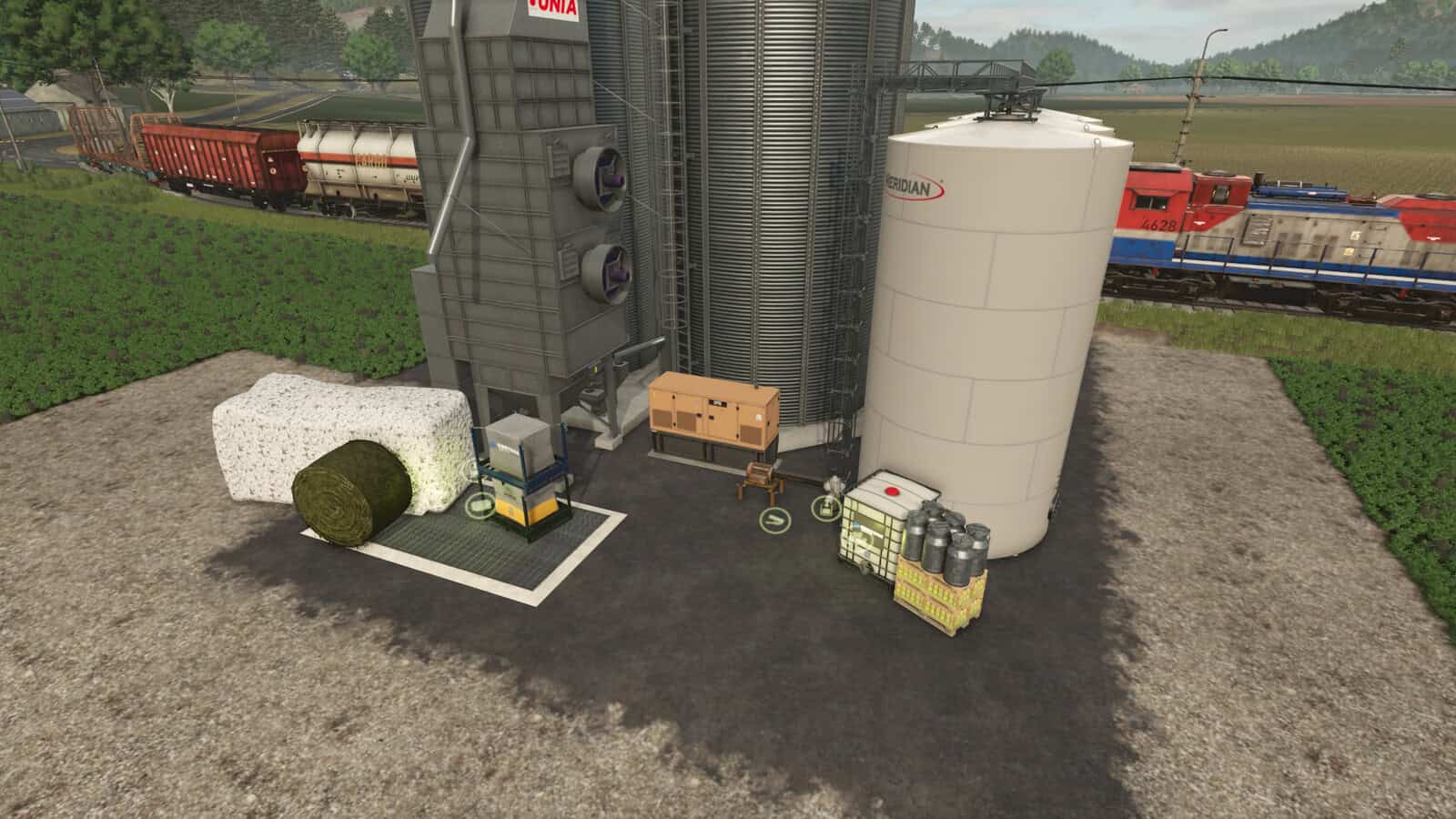 PLACEMENT: In order for the train side of the silo to hang over the train tracks, the owned field must be as close to the tracks as possible or must use a “Place Anywhere” mod.
