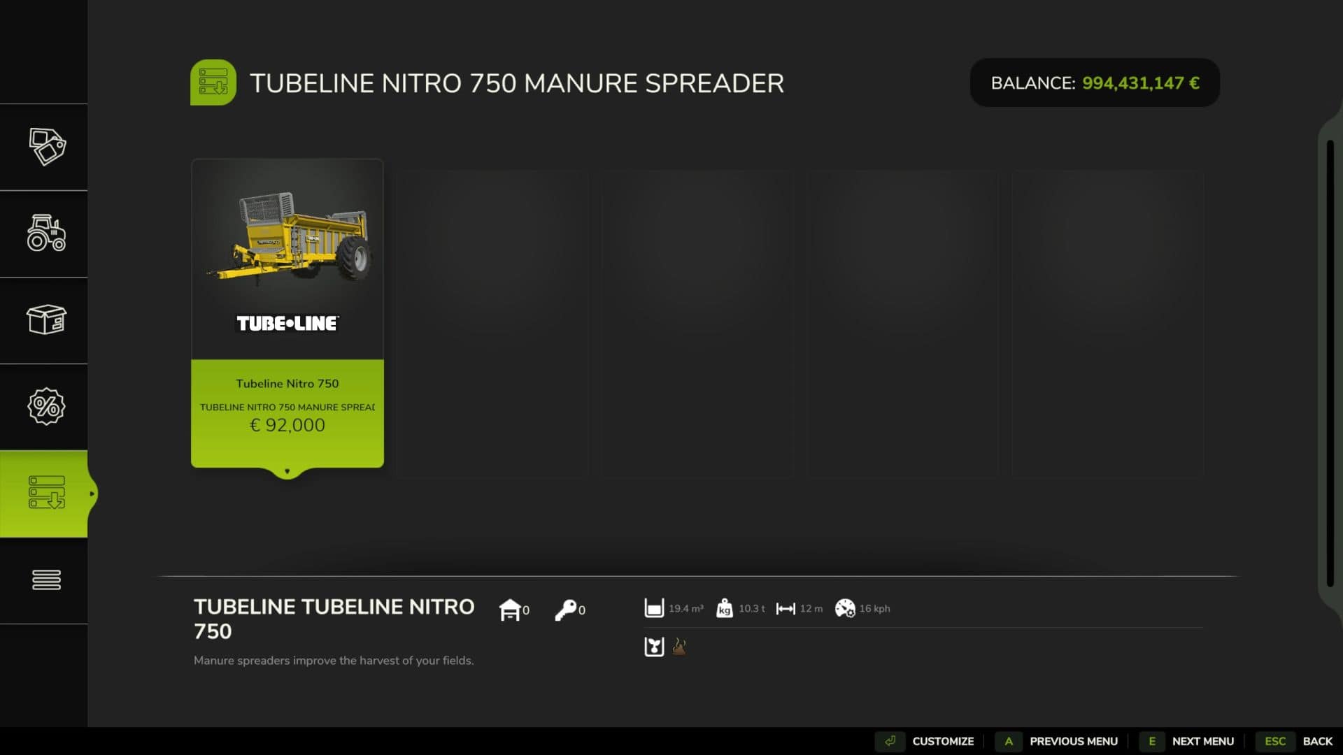 The Tubeline Nitro 750 is a manure spreader modified by LJR Modding for Farming Simulator 25. It adds the Tubeline Manufacturing Nitro 750 to the in-game shop. With its animated tailgate opening and choice of different tire brands, it is a reliable medium- to large-capacity manure spreader.