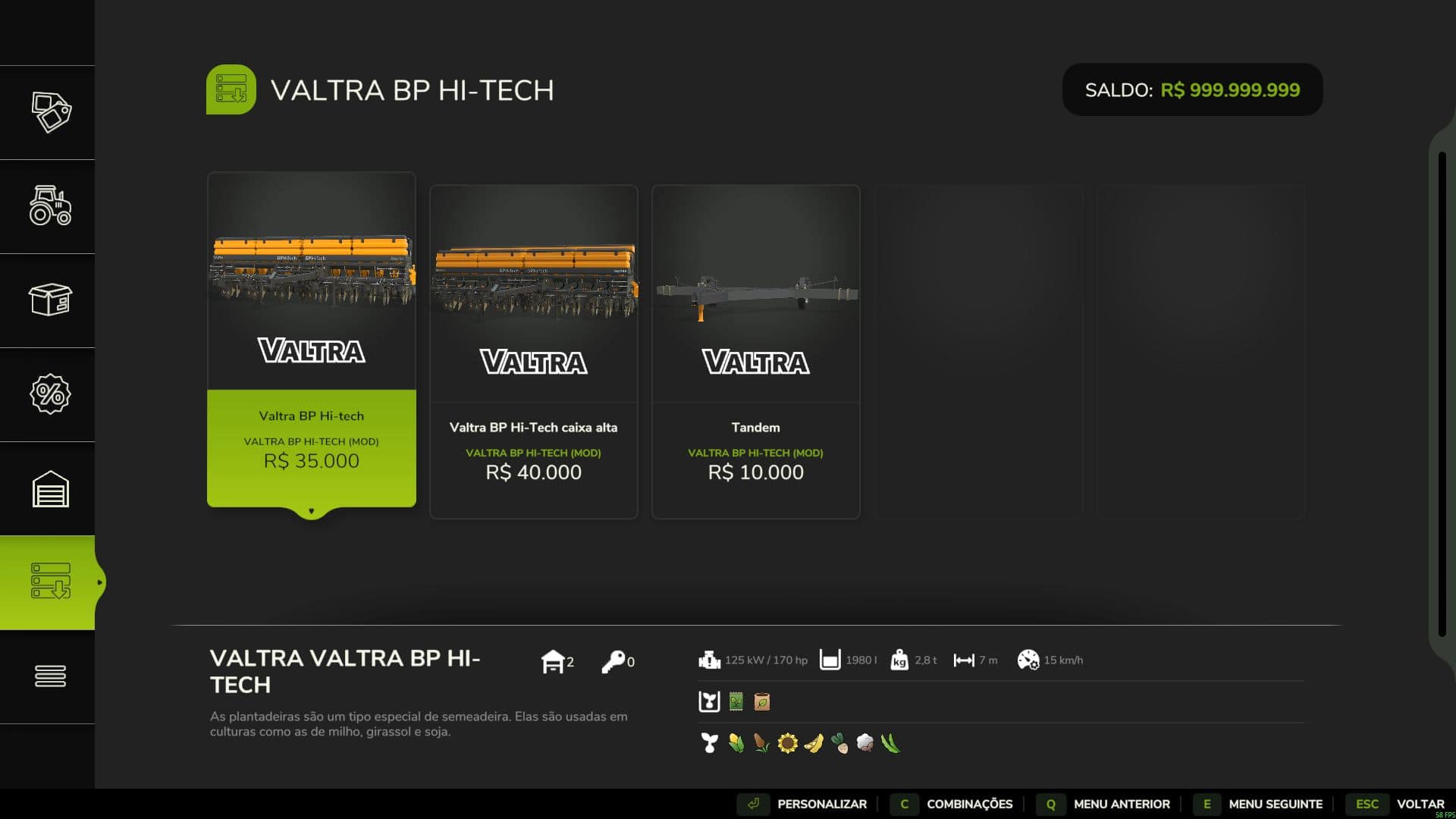 Valtra BP-Hitech Pack v1.0 FS25 Mods | 18 Dec, 2025 Valtra BP-Hitech Pack v1.0 Mod contains: – Plantadiera Valtra BP Hi-tech—-(R$35000) – Valtra BP Hi-tech High Box Planter—-(R$40000) – Tandem Valtra—-(R$10000) Author: Erick Santos This content was uploaded by our website visitors. If you notice any errors, please let us know.