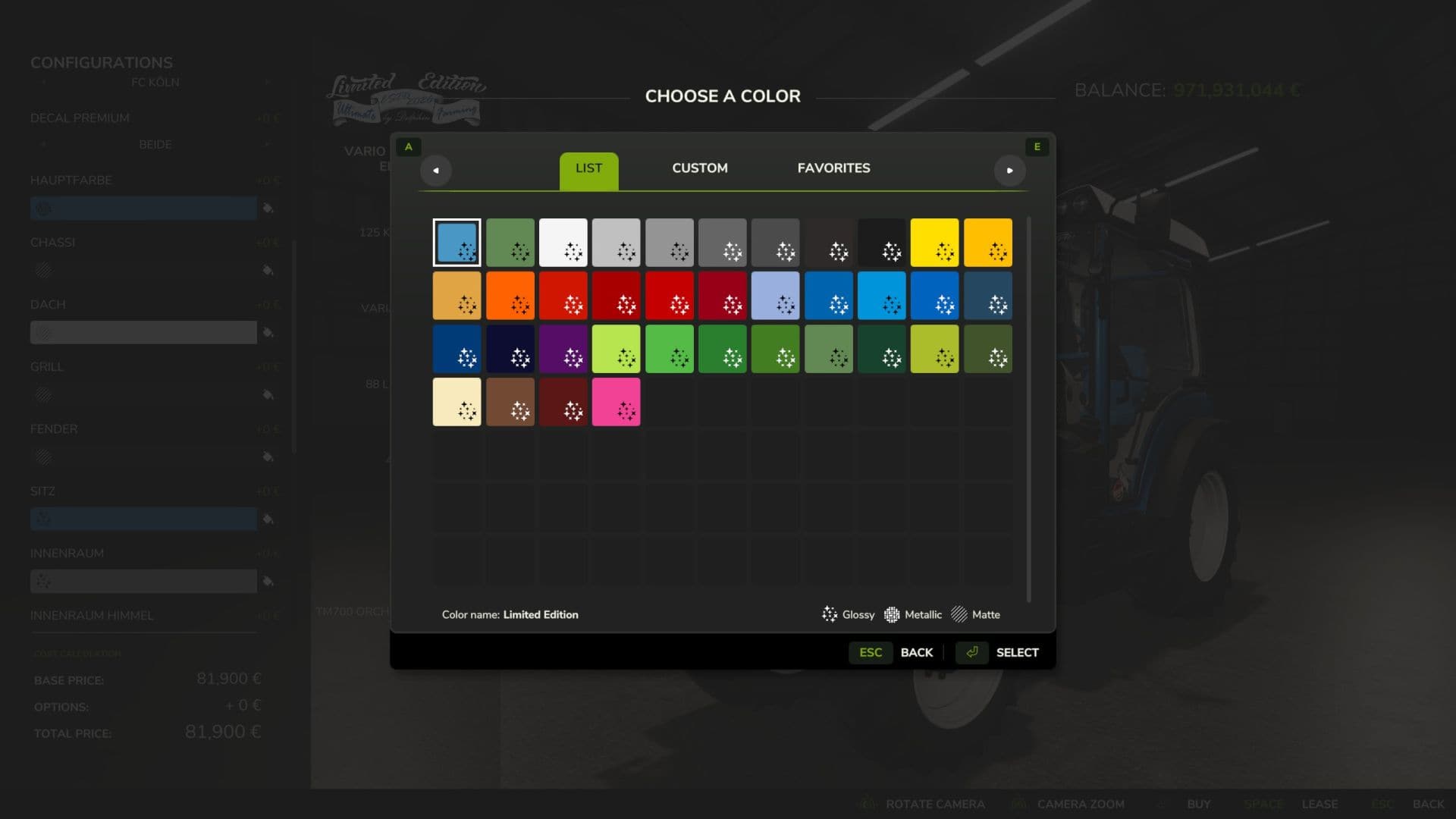 – Color choices for main color, chassis, roof, grille, fenders, seat, interior, headliner,steering wheel, seatbelt, armrest, armrest buttons, lettering, and wheel color;