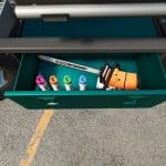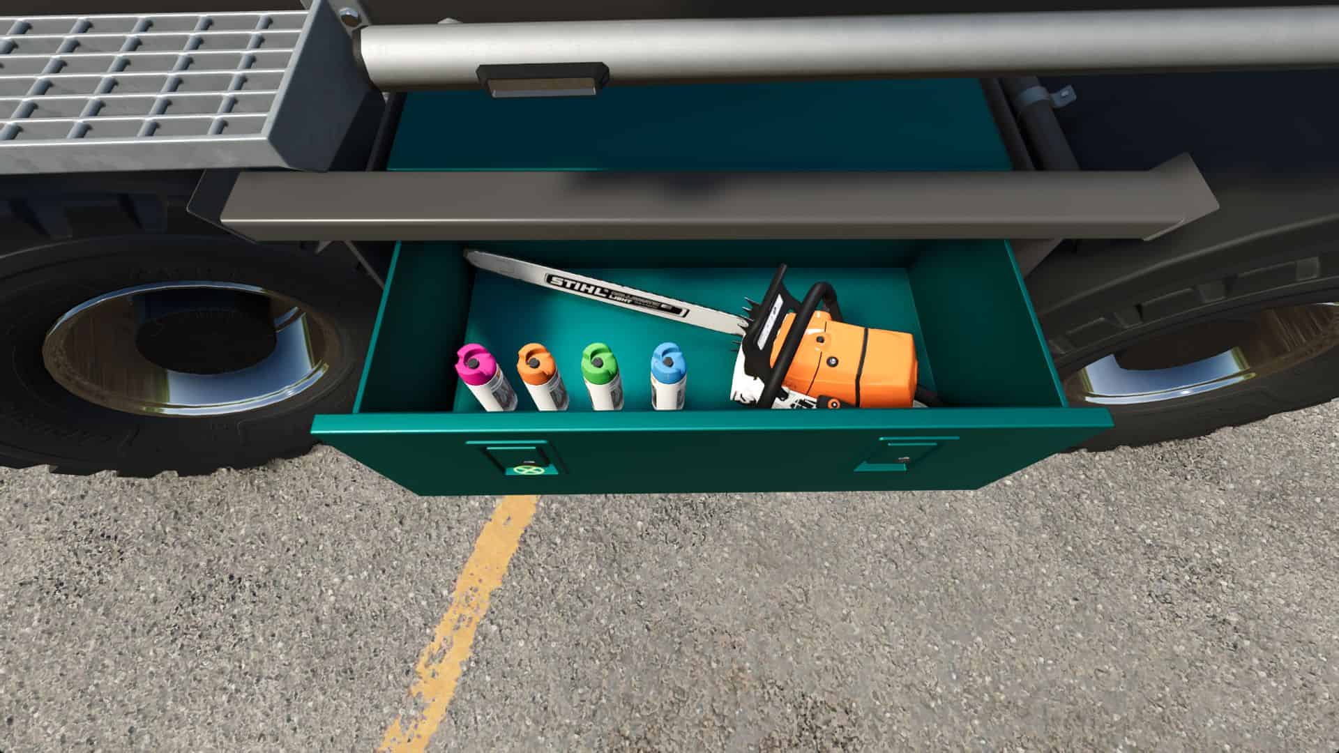 – Chainsaw holder and cleaning spray installed