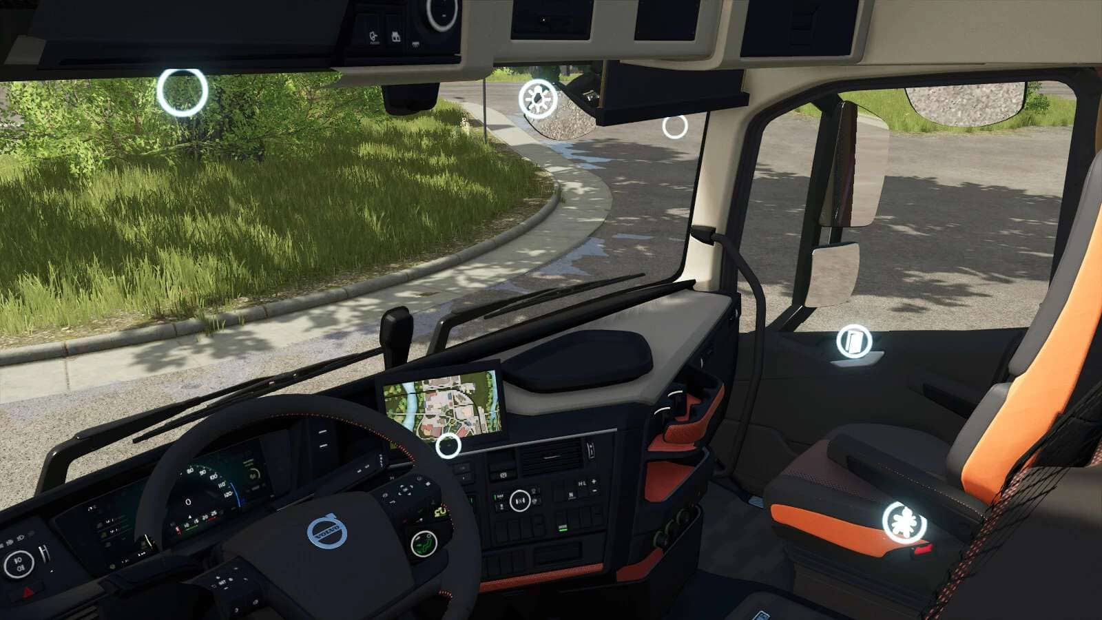 – There are some movable parts inside and outside the vehicle that are controlled by Interactive Control. Monitor in the cab could switch to mini map screens manually if you have installed Real GPS Mod. And of course you could skip the night in the sleeper if you have installed Vehicle Sleeper Cab.