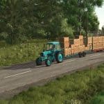 This machine is designed for loading fruit packed in containers, transporting them from between the rows of trees, and delivering them to storage and processing facilities for subsequent unloading.
