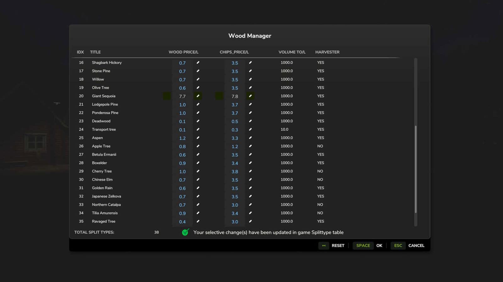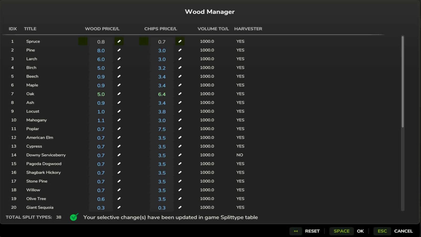 Wood Manager allows you to adjust the economics of all wood splitTypes directly inside the game. You can change the price per liter of logs and the woodchips yield for each wood type through a simple, fast in-game interface.